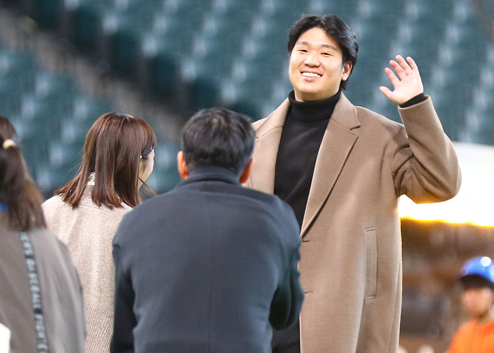 電撃訪問だった。ベージュのコートを着た古林が、ベンチ裏からフィールドに姿を現した。大型ビジョンには「WELCOME! 古林睿煬」と映し出されていた。マウンド付近に歩み寄ると、同行していた妻や球団関係者らと記念撮影。ファンの声援に手を振って応える場面もあった。