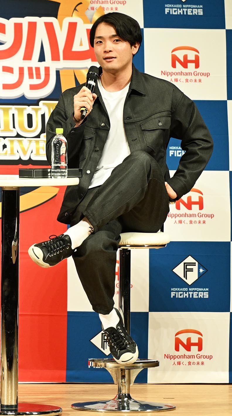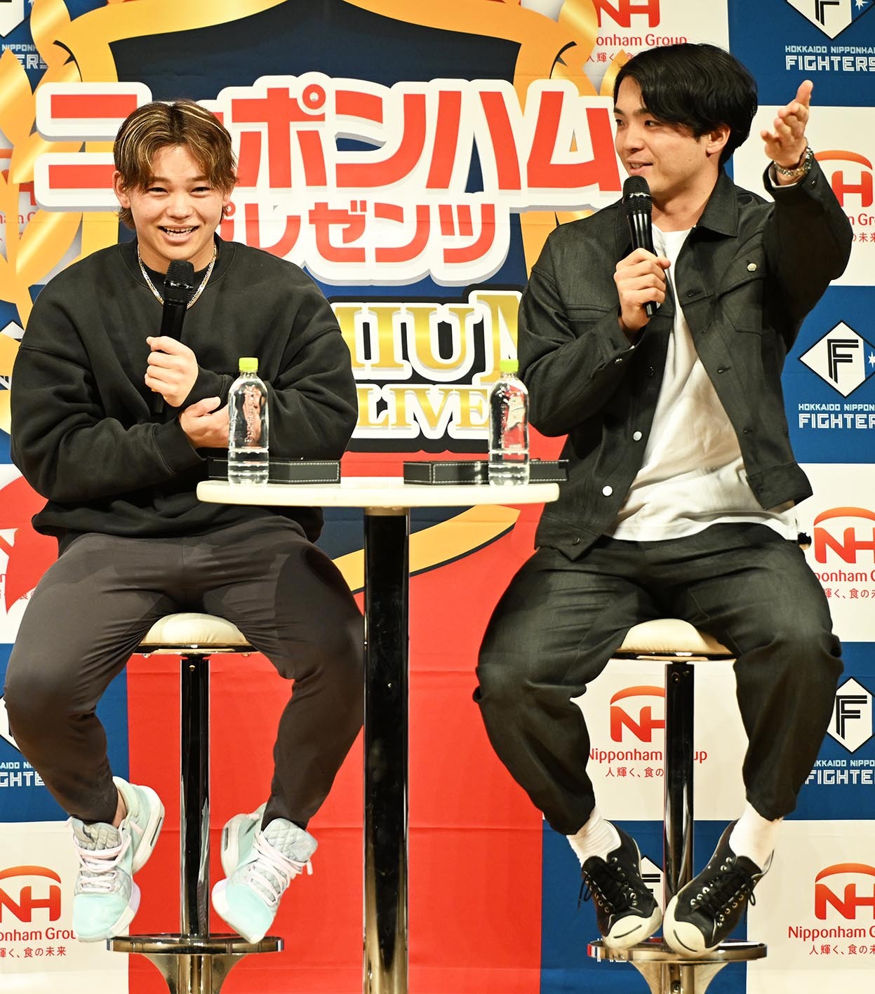 日本ハムの郡司裕也捕手(26)が25日、「ニッポンハムプレゼンツ プレミアムトークライブ」(北見会場)に田宮裕涼捕手(24)と共に出演した。トークでは水谷瞬外野手(23)の意外な一面を暴露するなど、会場を沸かせた。ファンと触れ合えるオフならではのイベントに「こういう機会は僕らもありがたいですね」と笑顔を見せた。