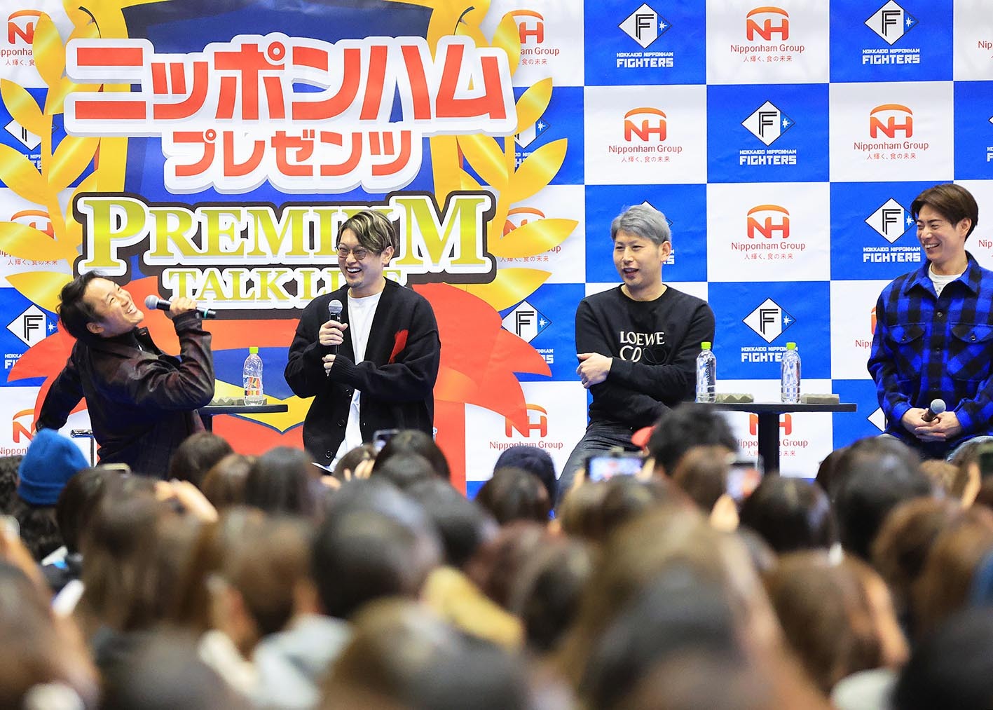 「ニッポンハムプレゼンツ プレミアムトークライブ」が25日、道内各地で行われ、北広島市のエスコンフィールド北海道会場に加藤貴之投手(32)、池田隆英投手(30)、松本剛外野手(31)、奈良間大己内野手(24)が登場した。4人は今季を振り返りながら、軽妙なトークを展開。質問コーナーでは名回答、珍回答が相次いだ。