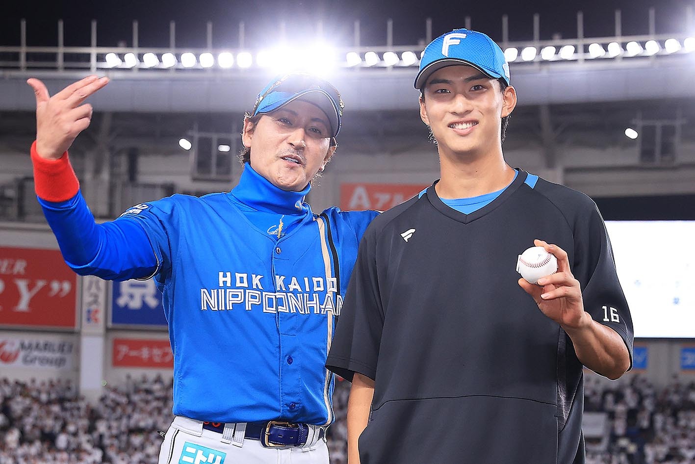 10月3日ロッテ戦、初勝利のウイニングボールを手にする達(右)と新庄監督