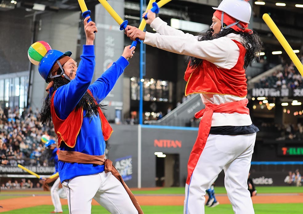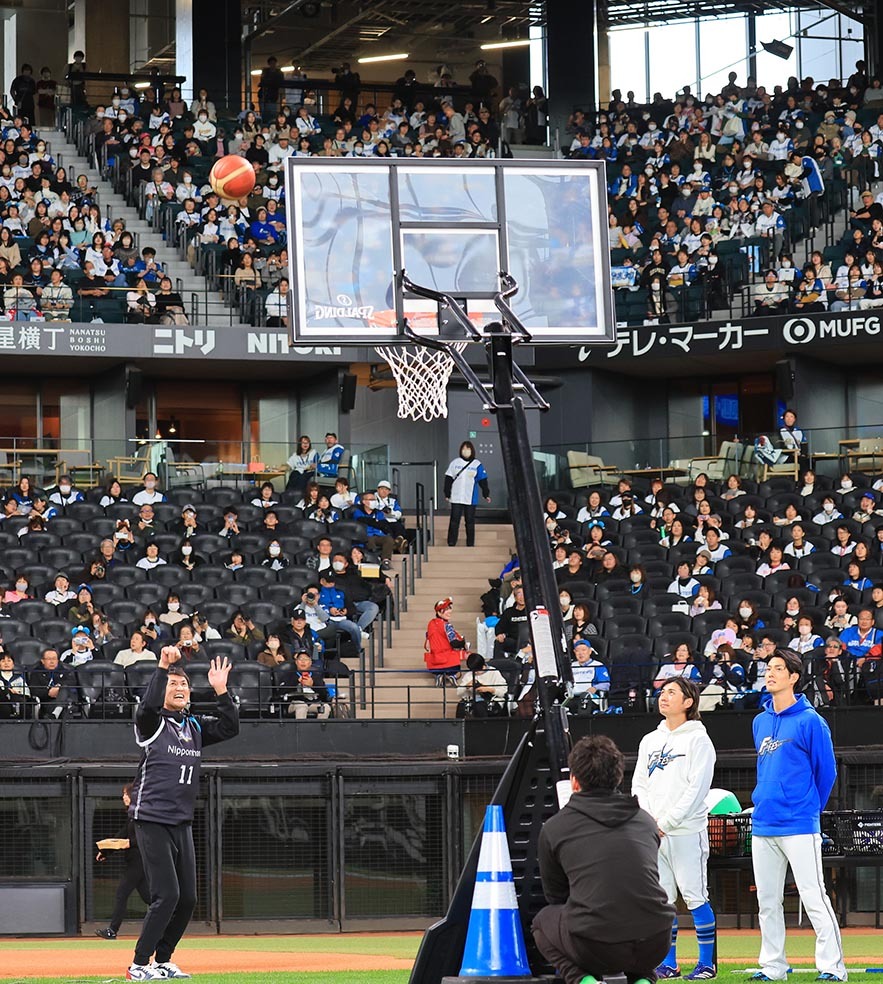来月下旬にエスコンフィールド北海道でBリーグの公式戦を行うレバンガ北海道の折茂武彦代表取締役社長がゲストで登場した。投げるボールや距離などは相手側がルーレットを回し、決定。先行の「松本海賊団」は上川畑が野球ボールをリングに沈めた。その後は両チーム無得点に終わり〝スミ1〟で「松本海賊団」が勝利した。
