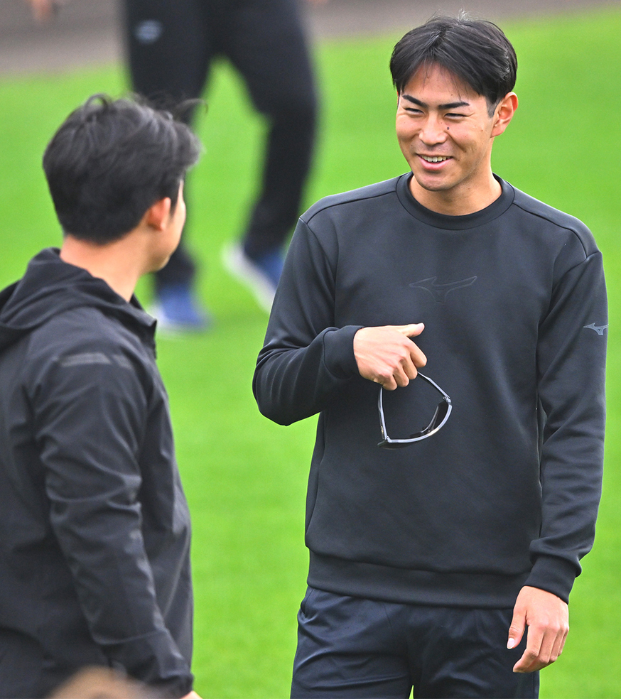 「結構、真面目に見えますけど、ふざけますね。いやあ、アホなんですよ。本当に。(今秋の)国頭キャンプ中、僕が朝6時すぎくらいに有酸素(運動)していたら、1人で砂浜に体育座りして海をずっと眺めていました。携帯とかいじらず、ただ座り続けている姿を見て、ザッキーらしいなって。写真ありますよ。面白くて撮っちゃったんですよ。20分くらいずっと座っていましたよ。まだ、いるわって。何していたか聞いたら、普段、海がないからね~、見ていたわ~って(笑)」