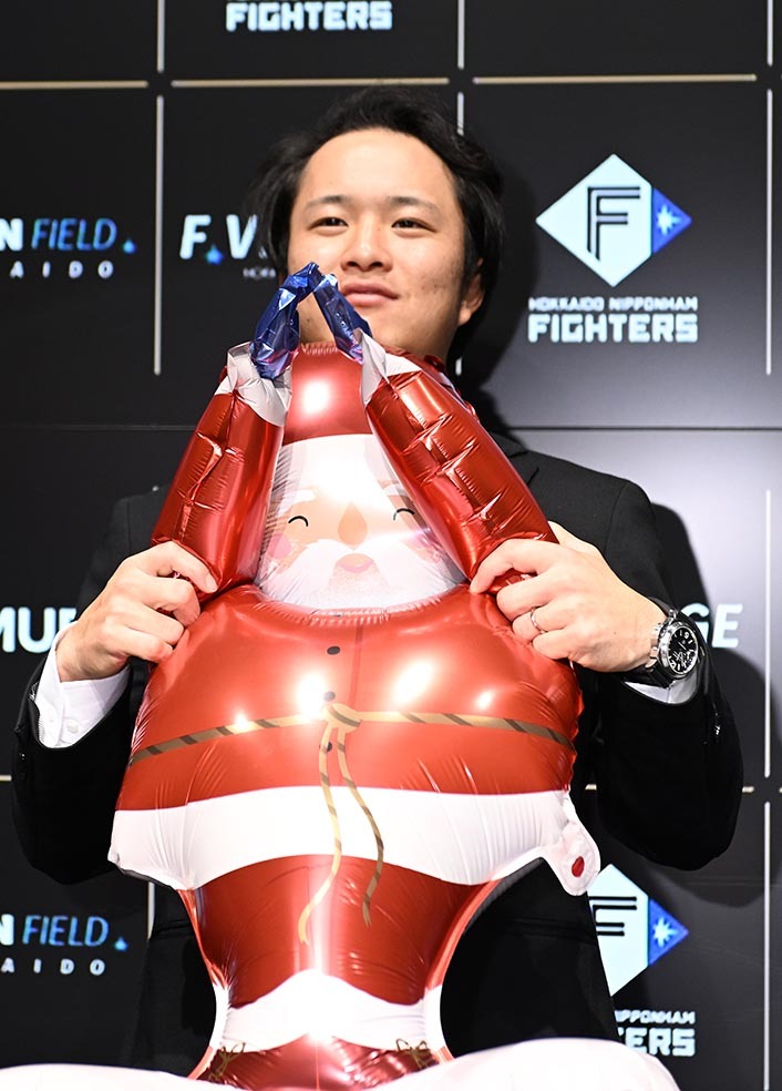 サンタバルーンとともに一丁締めポーズをする奈良間=撮影・小田岳史