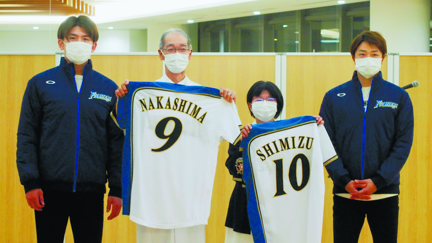 日本ハムの中島と清水が10日、北海道医療センター(札幌市西区)で行われた、コロナ禍で奮闘する医療従事者へ感謝の意を伝えるセレモニーに参加した。ユニホームを贈呈し、記念撮影をするなど交流した=写真。中島は「ぼくらが元気をもらいました。これから少しでも明るい話題を届けたい」と決意。清水は「野球でしか元気や勇気を与えられない。来季は観客が入ってやれる中で、見に来てもらえたら力になります」と呼びかけた。(札幌)
