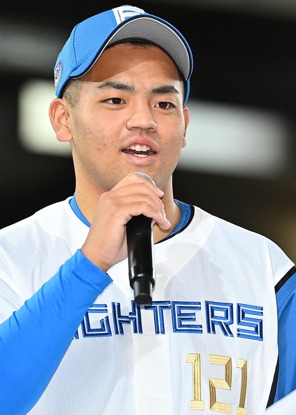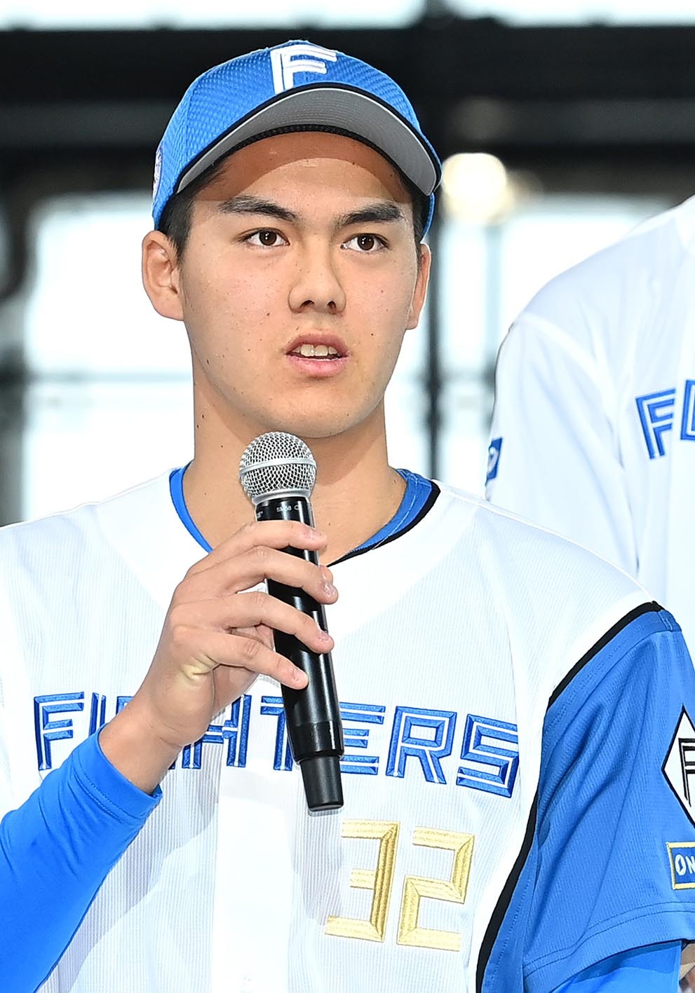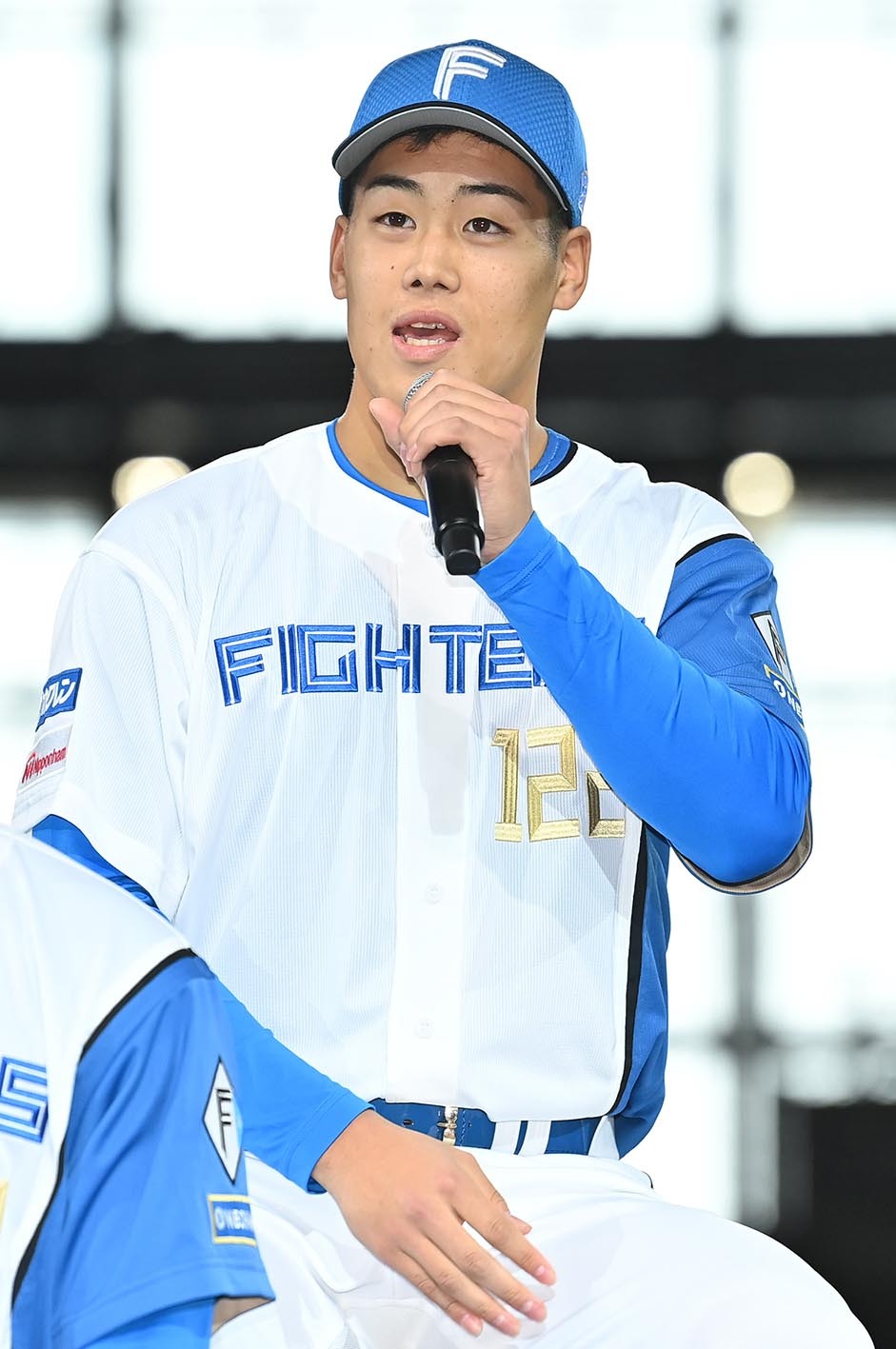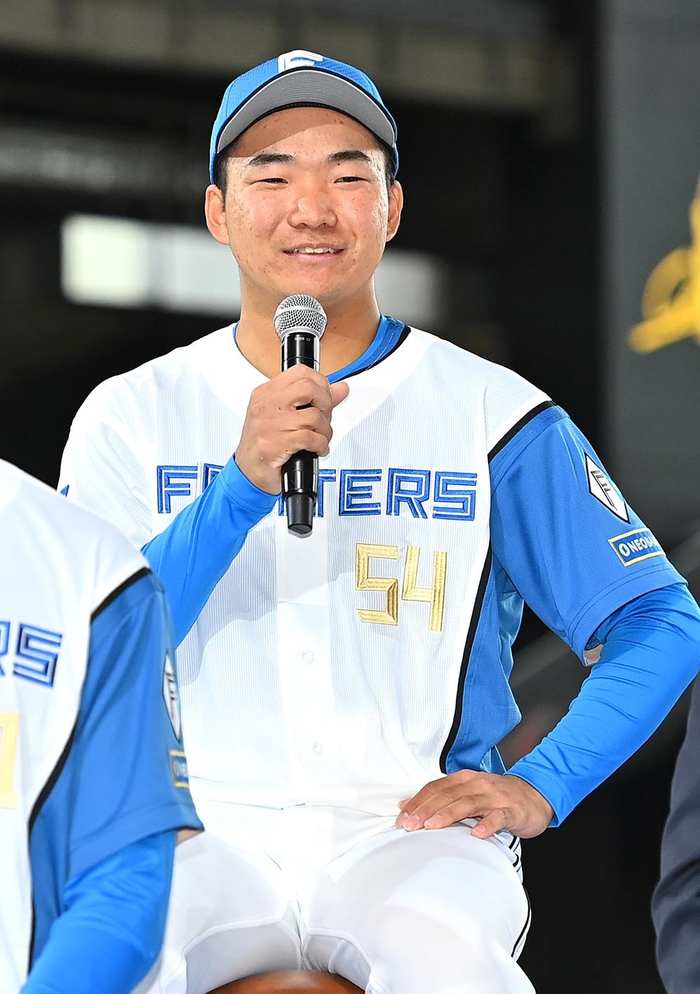 日本ハムの新入団会見が8日、エスコンフィールド北海道で行われ、今秋のドラフト会議で指名された支配下6人と育成2人が背番号入りのユニホーム姿で登場した。約1200人のファンが見守る中、ファイターズの未来を担うルーキーたちが、力強く決意表明。同席した新庄剛志監督(52)も大きな期待を寄せた。会見の要旨は以下の通り。