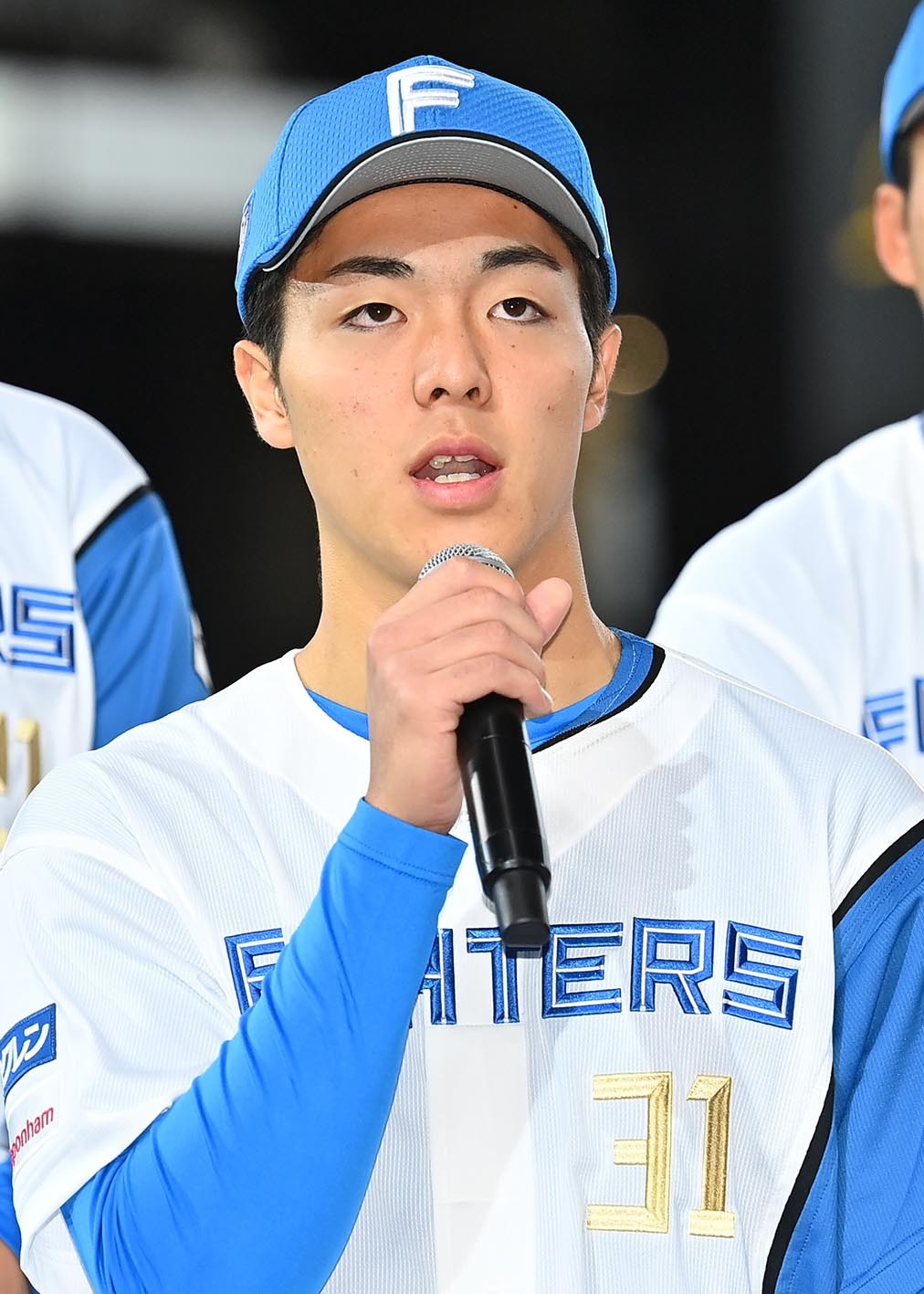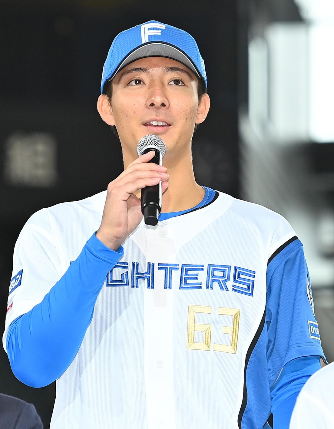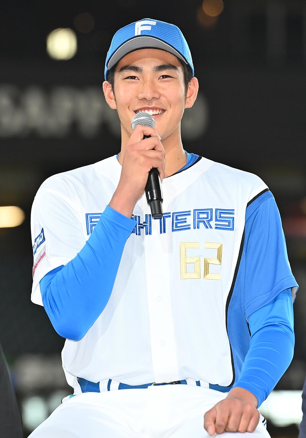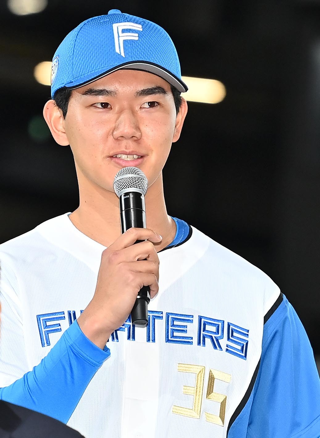 日本ハムの新入団会見が8日、エスコンフィールド北海道で行われ、今秋のドラフト会議で指名された支配下6人と育成2人が背番号入りのユニホーム姿で登場した。約1200人のファンが見守る中、ファイターズの未来を担うルーキーたちが、力強く決意表明。同席した新庄剛志監督(52)も大きな期待を寄せた。会見の要旨は以下の通り。