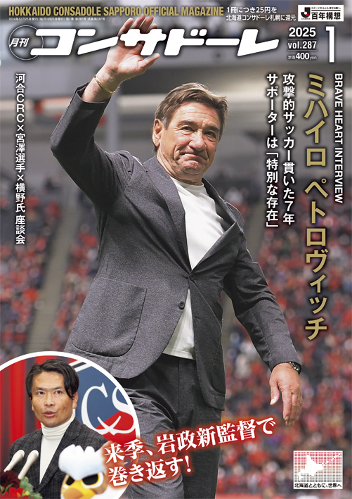 北海道コンサドーレ札幌のオフィシャルマガジン「月刊コンサドーレ」1月号を25日に発売する。「BRAVE HEART INTERVEW」は今季限りで退任となるミハイロ・ペトロヴィッチ監督。チームに攻撃的なミシャサッカーを植え付け、7年間で札幌をJ1に定着させた名将。今季は残念ながらJ2降格となってしまったが、クラブ、サポーターへ感謝の思いを切々と語っている。また、来季から指揮を執る岩政大樹新監督の就任会見の模様も取り上げた。