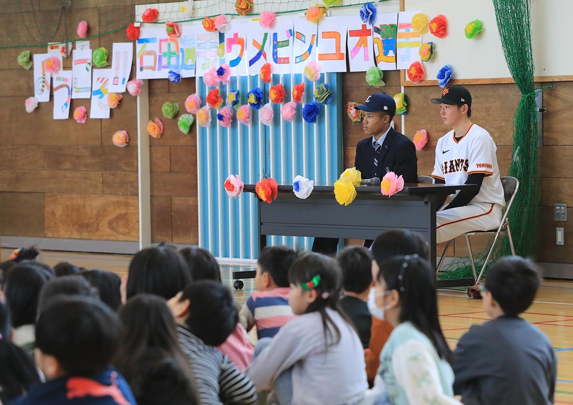 巨人・石田充冴と西武・オケムの同級生コンビが母校訪問 将来の対決誓う