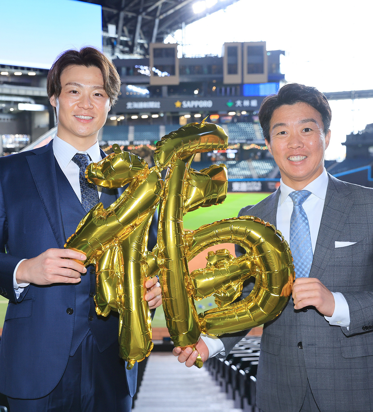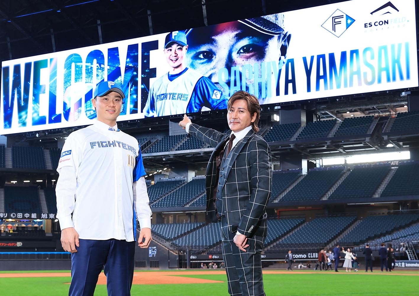 2023年12月6日、FA入団会見で新庄監督(右)と写真に収まる山崎