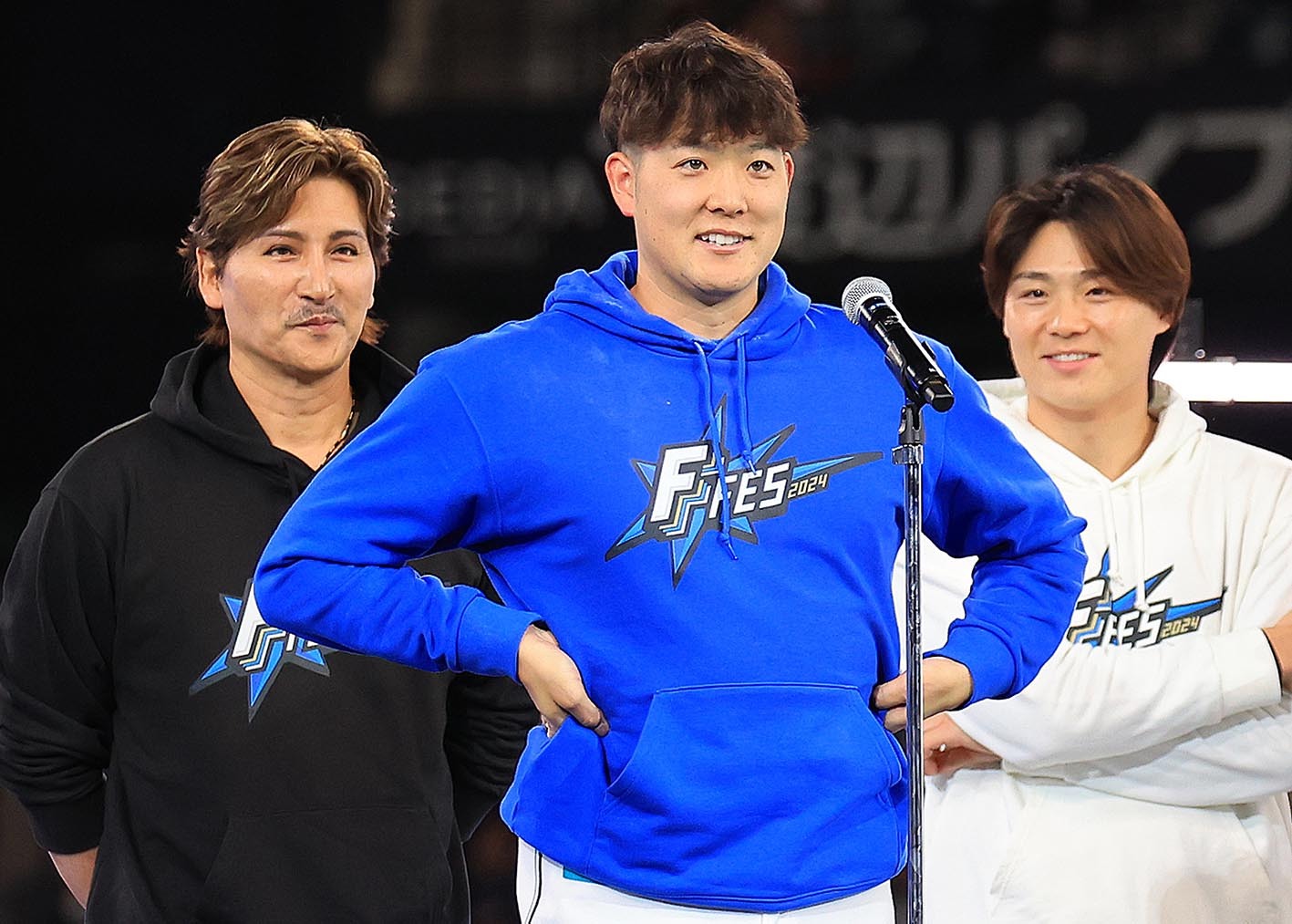2024年12月のFフェスで、今シーズンの抑え投手に指名され、あいさつする斎藤