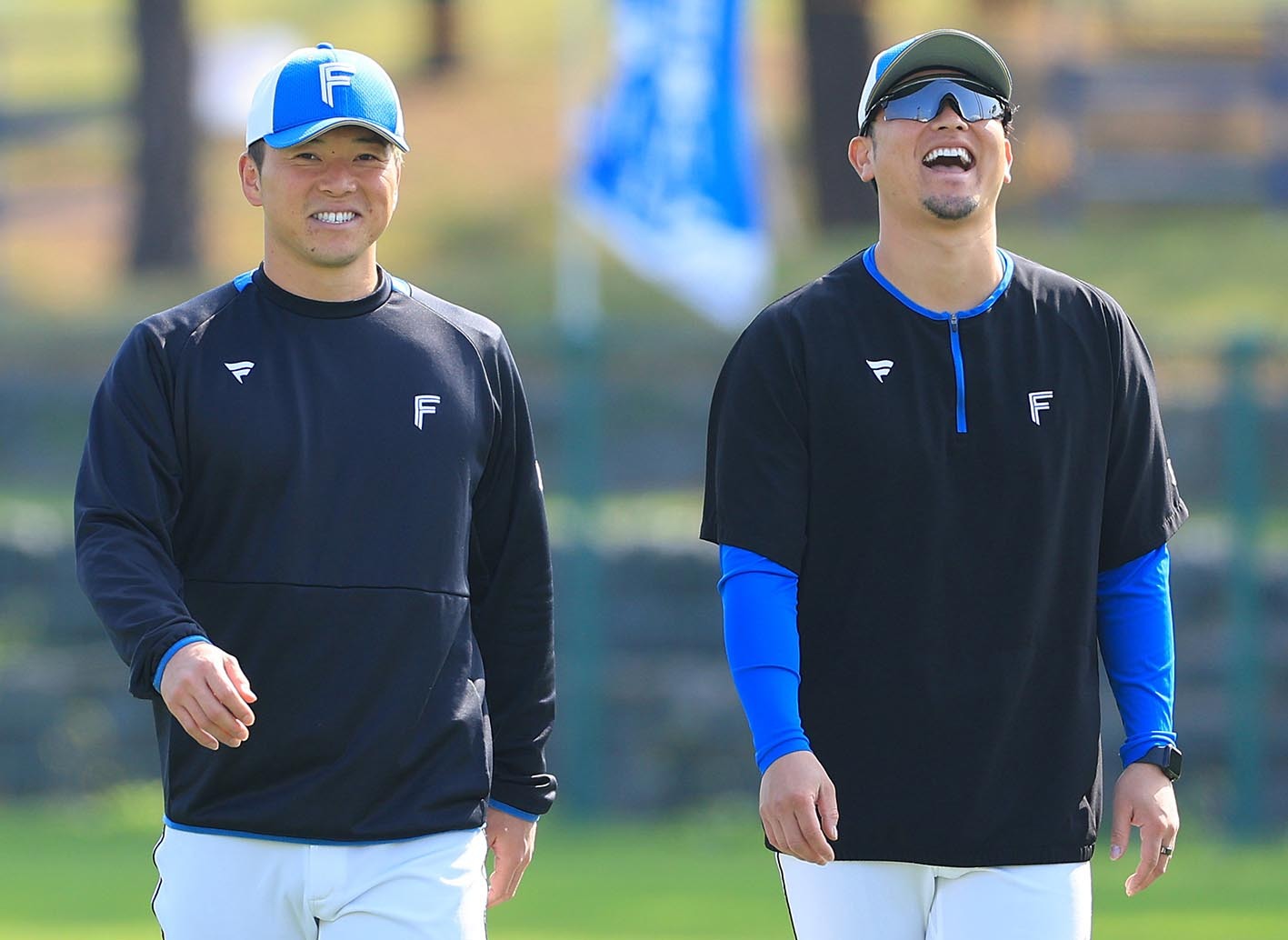 2024年2月、名護キャンプで談笑する生田目(左)と池田