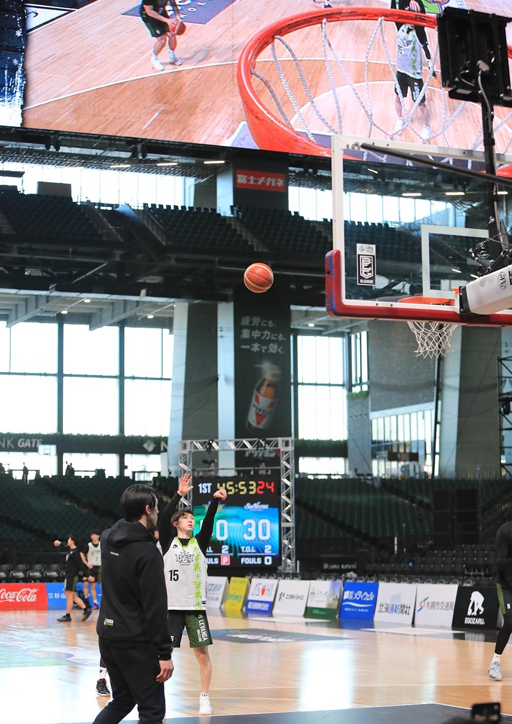 何から何までいつものコートとは違う雰囲気の中、島谷ら選手は時間が許す限り、雰囲気を確かめた。「想像以上に素晴らしすぎて、すごく明日の試合も楽しみ。今日の練習も楽しかった」と興奮気味。25日の練習公開の際には、きたえーると比べものにならない程高い天井や、ゴール板後方の距離感を少し心配していたが「コートコンディションが、いつもより滑るのかな、と思った。そこでボールのハンドリングや、フットワークの部分もそうですけど、シュートのところよりは僕はそっち(滑ること)が少し気になったので、気を付けないといけないのかも」。万全の対策を練って、本番を迎える。