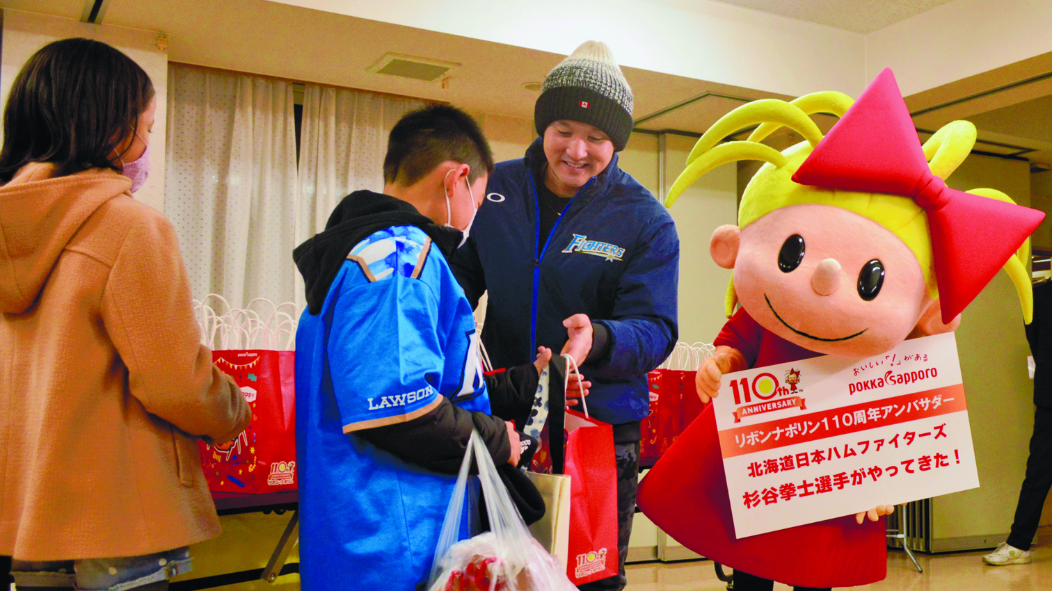 「Ribbonナポリン」のアンバサダーを務める杉谷が13日、札幌市の「こども食堂ぐれーす」を訪れ、子供たちにクリスマスプレゼントとして「Ribbonナポリン」などを手渡した。「素敵な笑顔も見られたし、僕も『また野球頑張ろう』という気持ちにさせてもらった」と笑顔で振り返った。