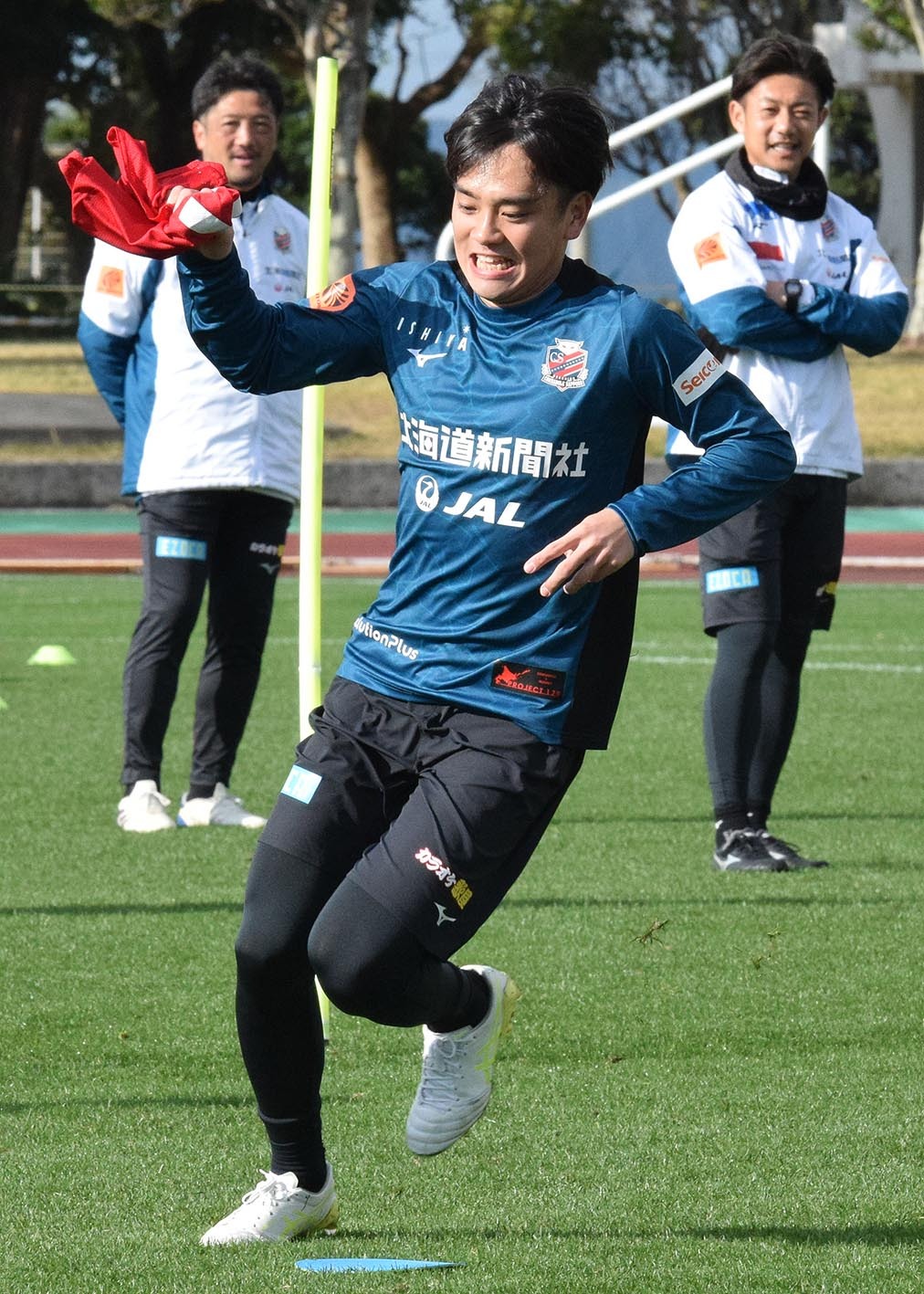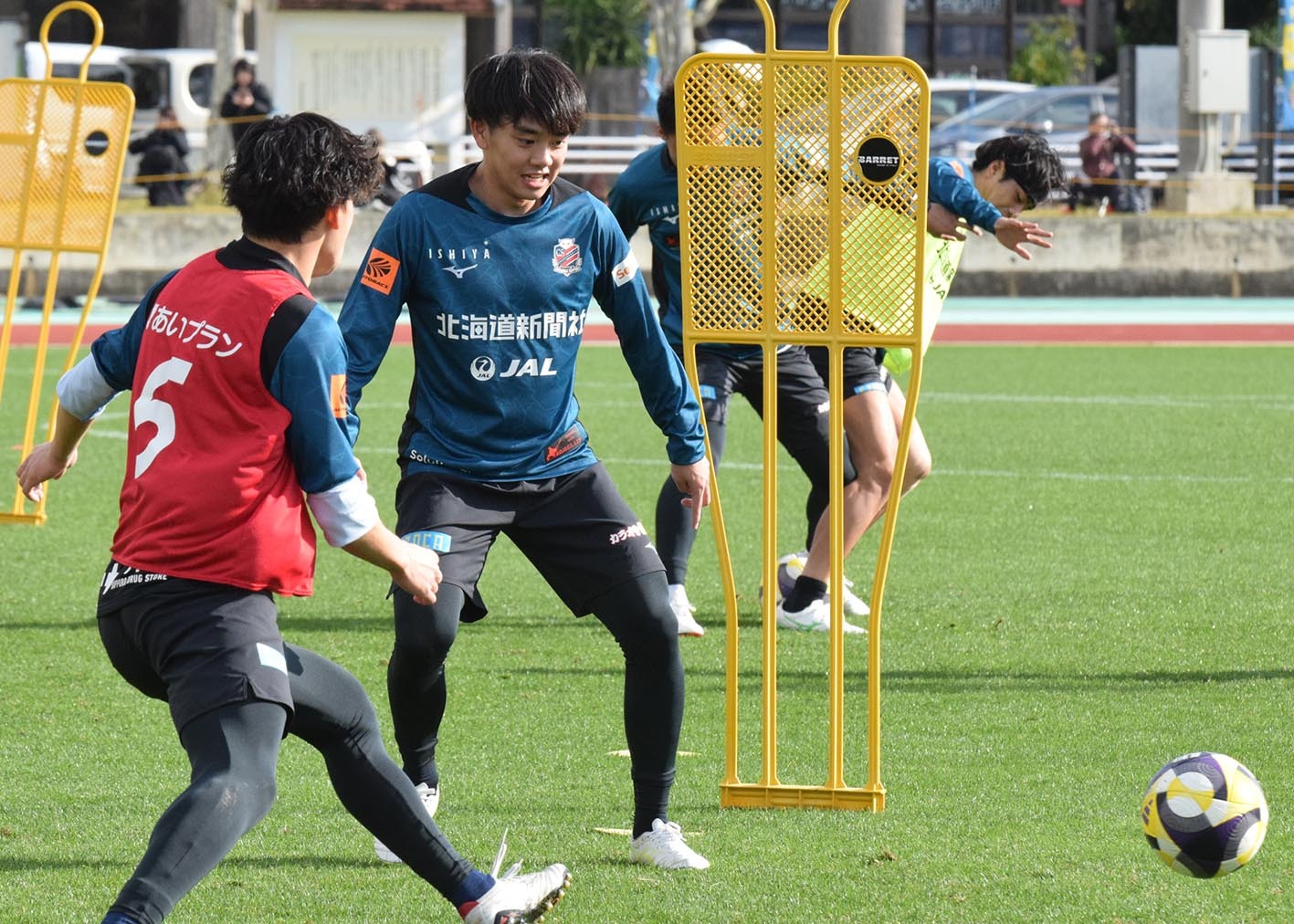 北海道コンサドーレ札幌は17日、1次キャンプ地の沖縄・金武町で全体練習を行った。この日からFW佐藤陽成(大阪体育大3年)、MF永井大士(桐蔭横浜大3年)、MF安部友兜(名古屋産業大1年)の3選手が練習に参加。紅白戦メンバーに名を連ね、ピッチ上で躍動した。