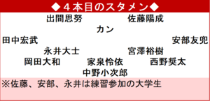 「メッセージは、そんなに込めてないです。残り2試合ありますし、熊本へ行ってからも2試合ある。全体の中でいろいろな組み合わせを見る。とはいえ、どこもスタートダッシュを狙って行かないといけない。バラバラにメンバーを組んで、チーム作りが間に合わないことがないようにしないと。その辺のバランスを見ながら考えました」