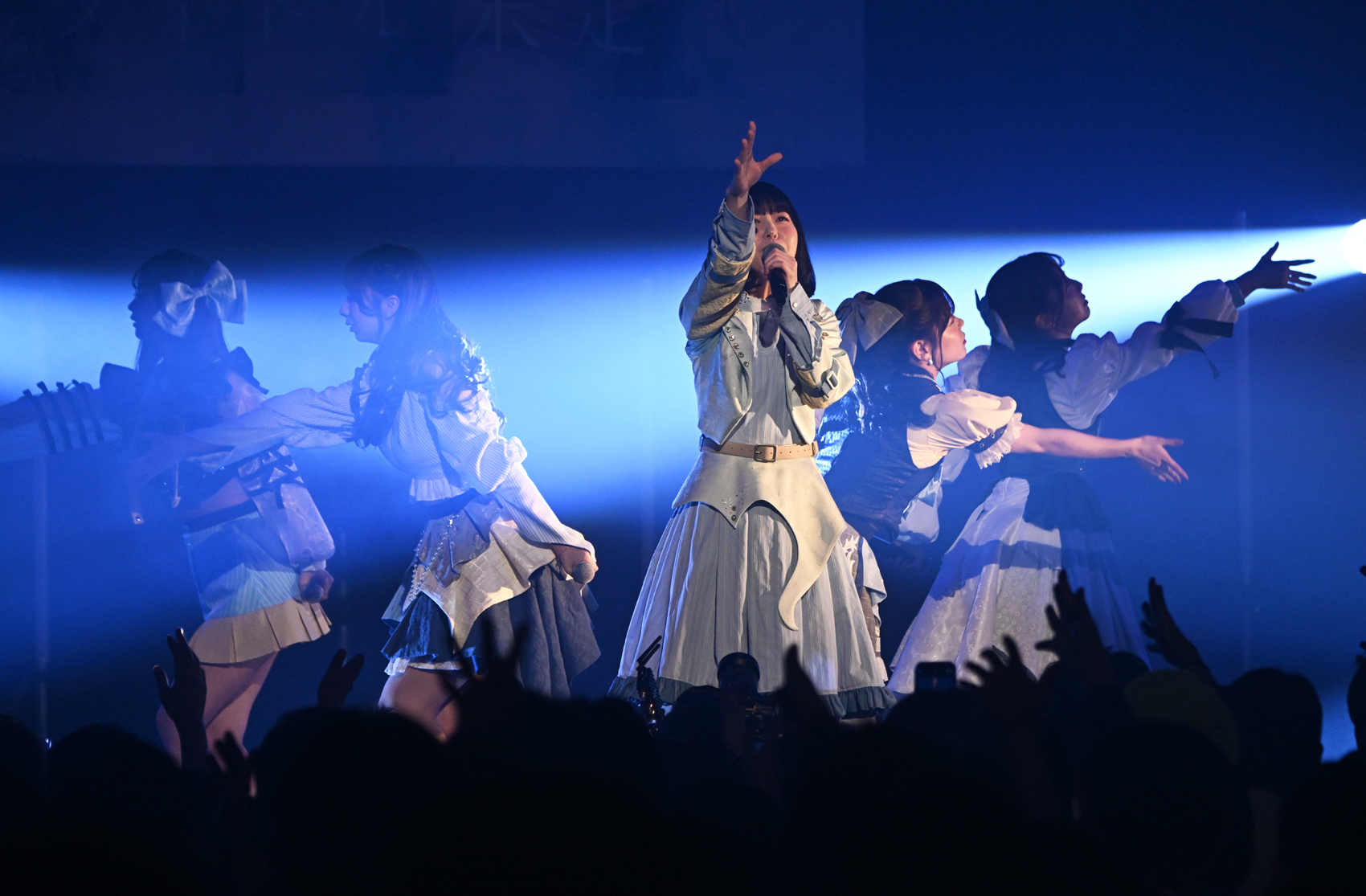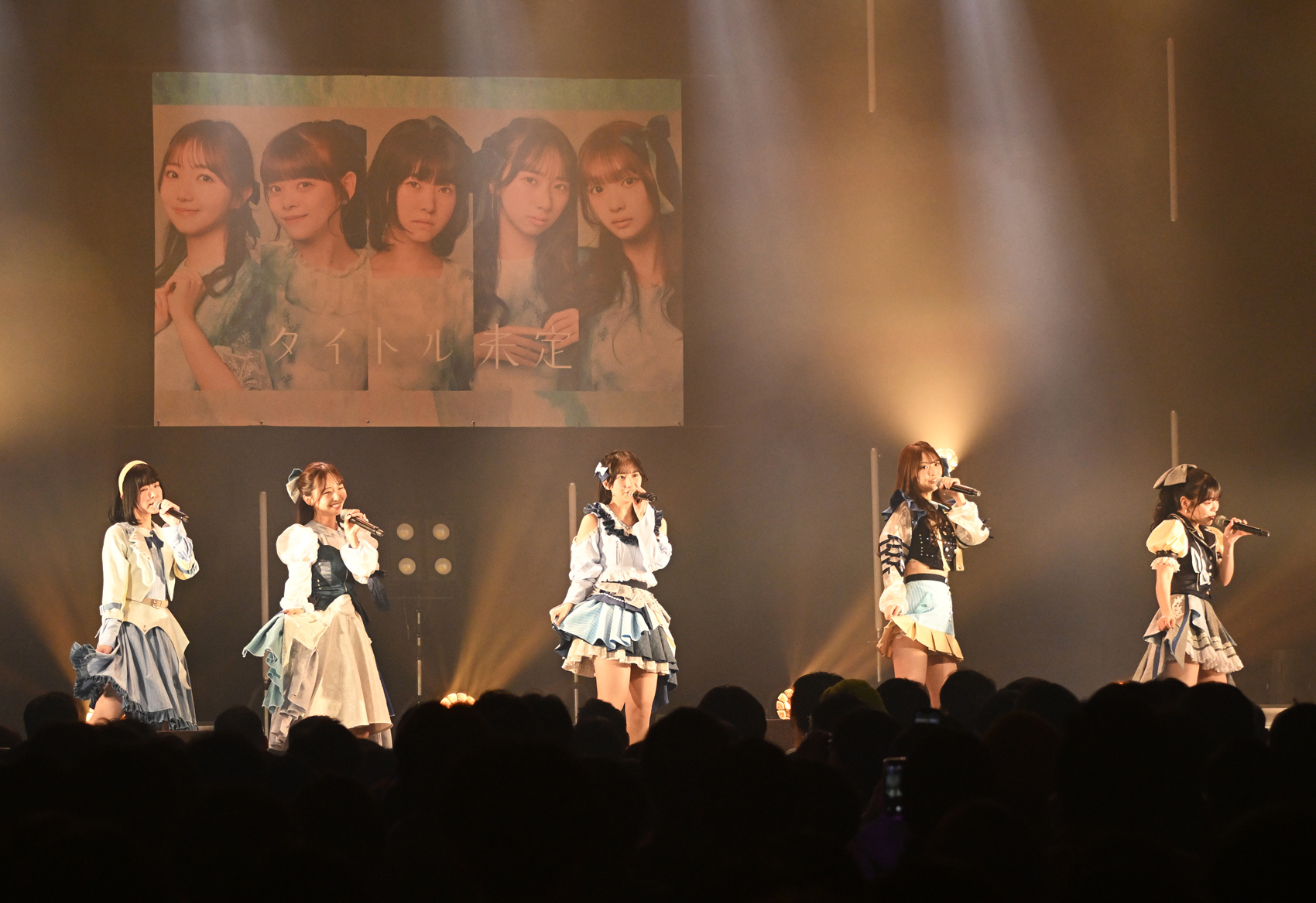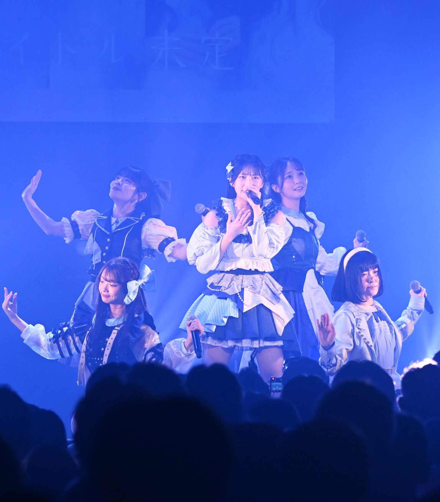 幕が降りると、新衣装に身を包んだ5人がステージに登場。新体制一発目に披露したのは「黎明」だった。イントロで冨樫優花が「新しいタイトル未定もよろしくお願いします」とクールにMC。新たな2つの声色が加わったことで、厚みの増した「黎明」に会場の期待感はグッと高まった。そして、タイトル未定の始まりの曲「踏切」。曲の中盤では、約4年ぶりにアイドルとしてステージに上がった多田が感極まる場面も見られた。その後、心地よさを感じさせるナンバー「蜃気楼」と続き、オープニング3曲を一気に駆け抜けた。