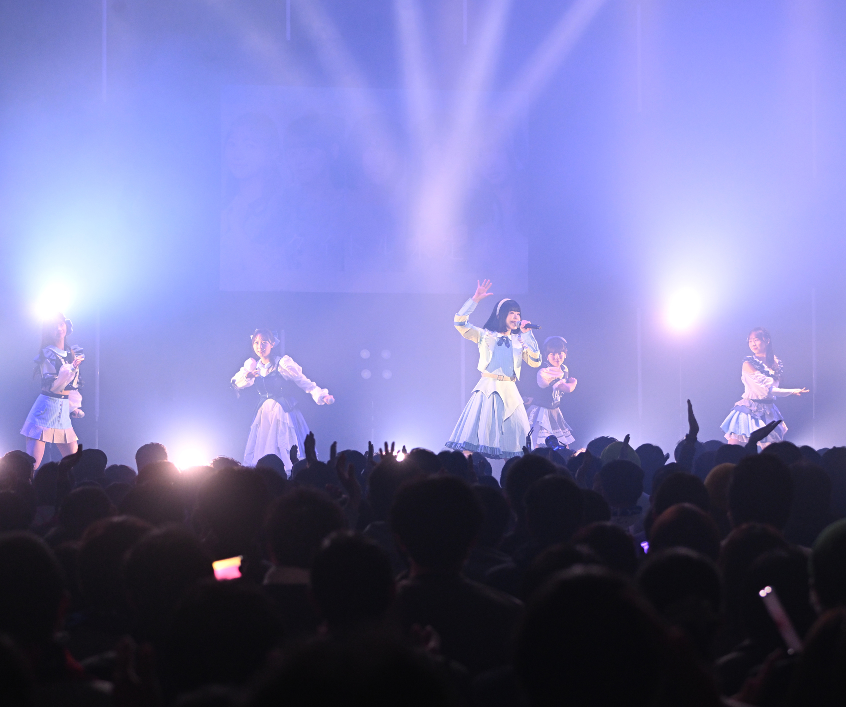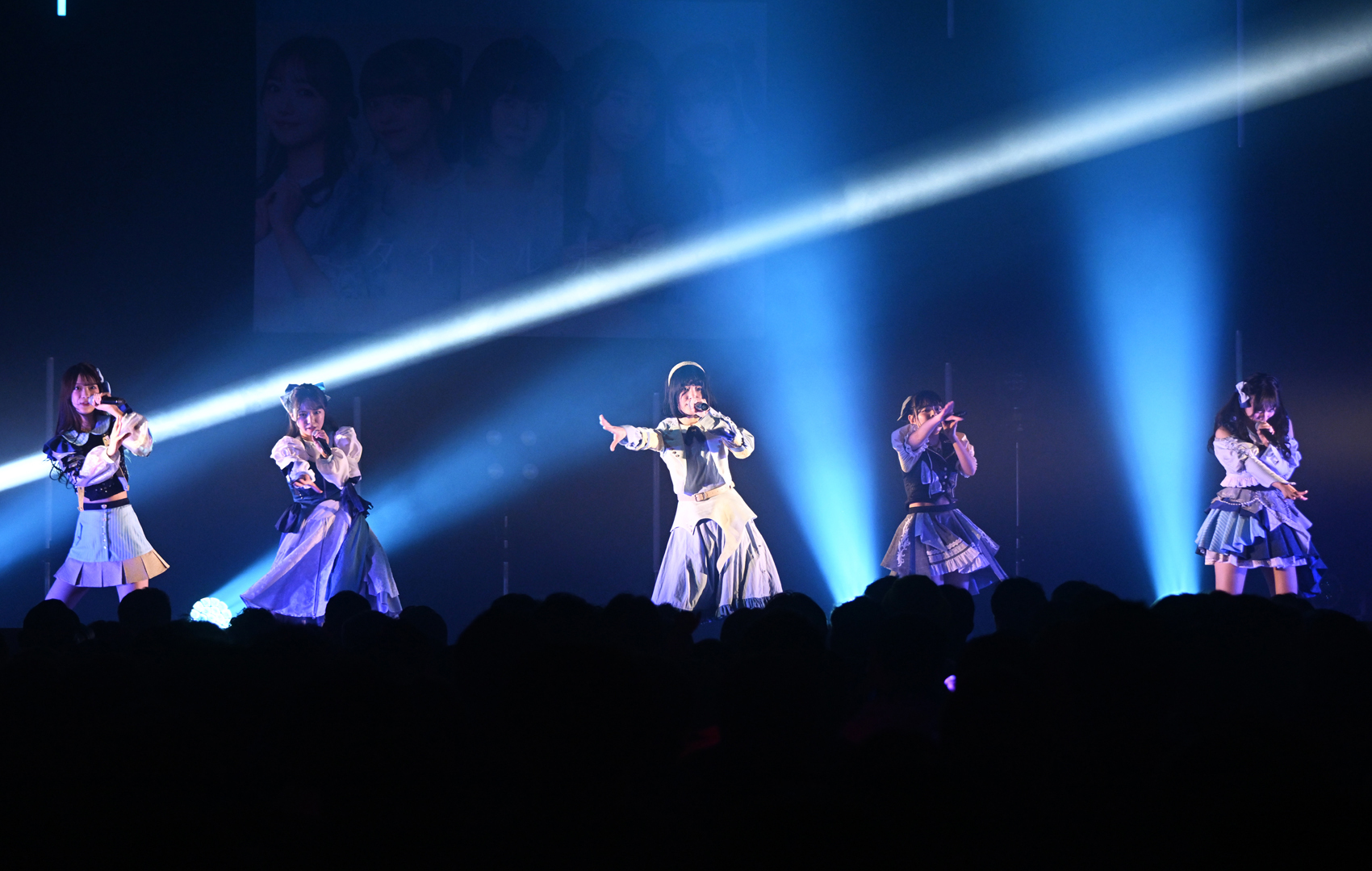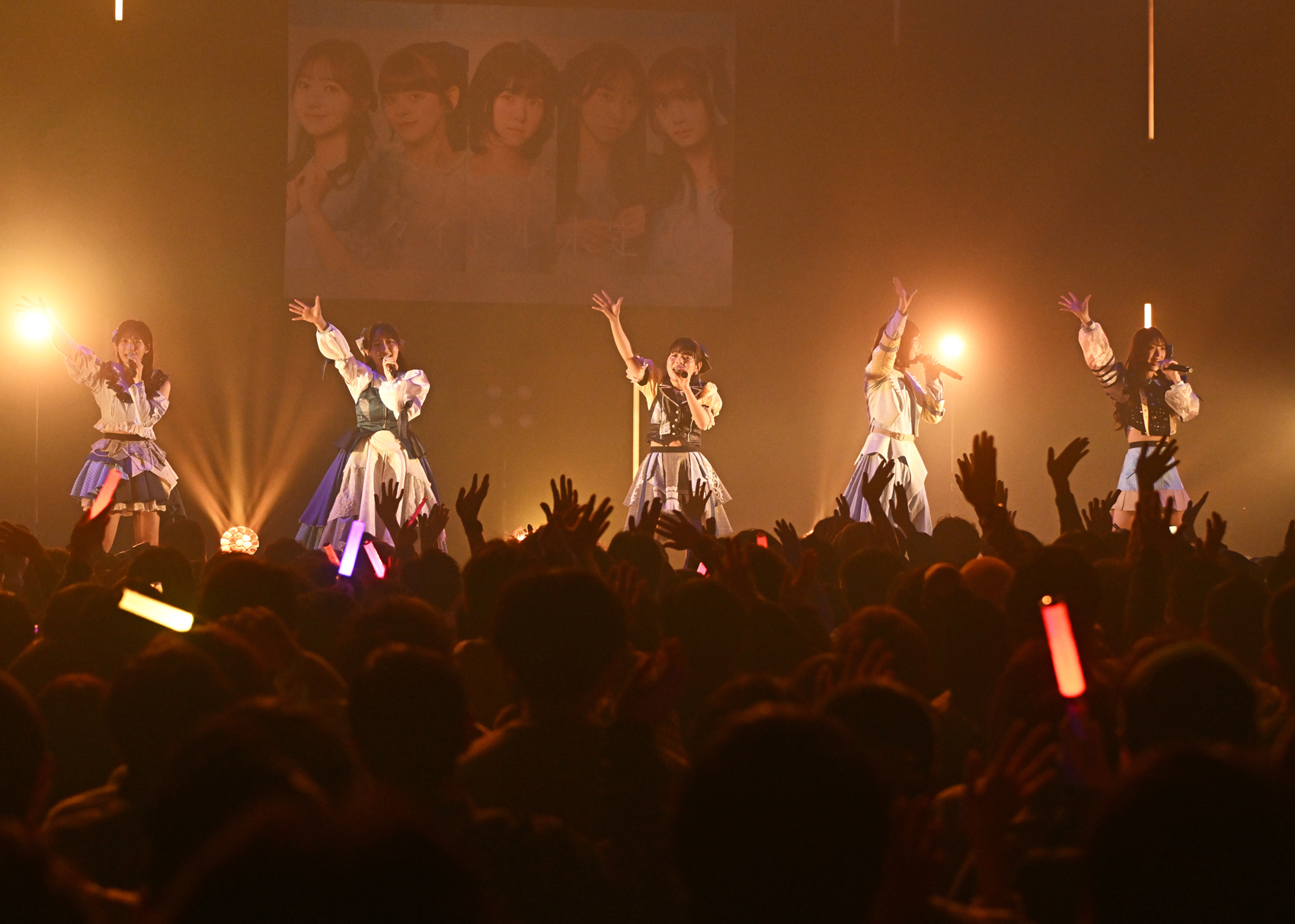 幕が降りると、新衣装に身を包んだ5人がステージに登場。新体制一発目に披露したのは「黎明」だった。イントロで冨樫優花が「新しいタイトル未定もよろしくお願いします」とクールにMC。新たな2つの声色が加わったことで、厚みの増した「黎明」に会場の期待感はグッと高まった。そして、タイトル未定の始まりの曲「踏切」。曲の中盤では、約4年ぶりにアイドルとしてステージに上がった多田が感極まる場面も見られた。その後、心地よさを感じさせるナンバー「蜃気楼」と続き、オープニング3曲を一気に駆け抜けた。