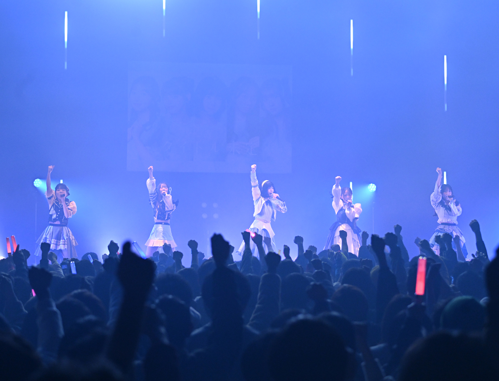 グッズ紹介などのMC後は、ラストスパート。まずは「壊せ」で、観客と一緒になってタオルを振り回してボルテージを上げ、FNS歌謡祭でも披露した「鼓動」、さらに「青春群像」とタイトル未定を代表する2曲が続いた。新体制のスタートを後押しするように、オーディエンスも拳を突き上げ、全力のコールで応えた。この日フィナーレを飾ったのは「花」。再出発にふさわしい真っすぐな曲を、5人の声色で届けた。最後に一人一人がこの日の感想を述べて、新メンバーの多田、山下は涙する場面も見られた。無事に全12曲をパフォーマンスし、5人体制となったタイトル未定のお披露目ライブは終了した。