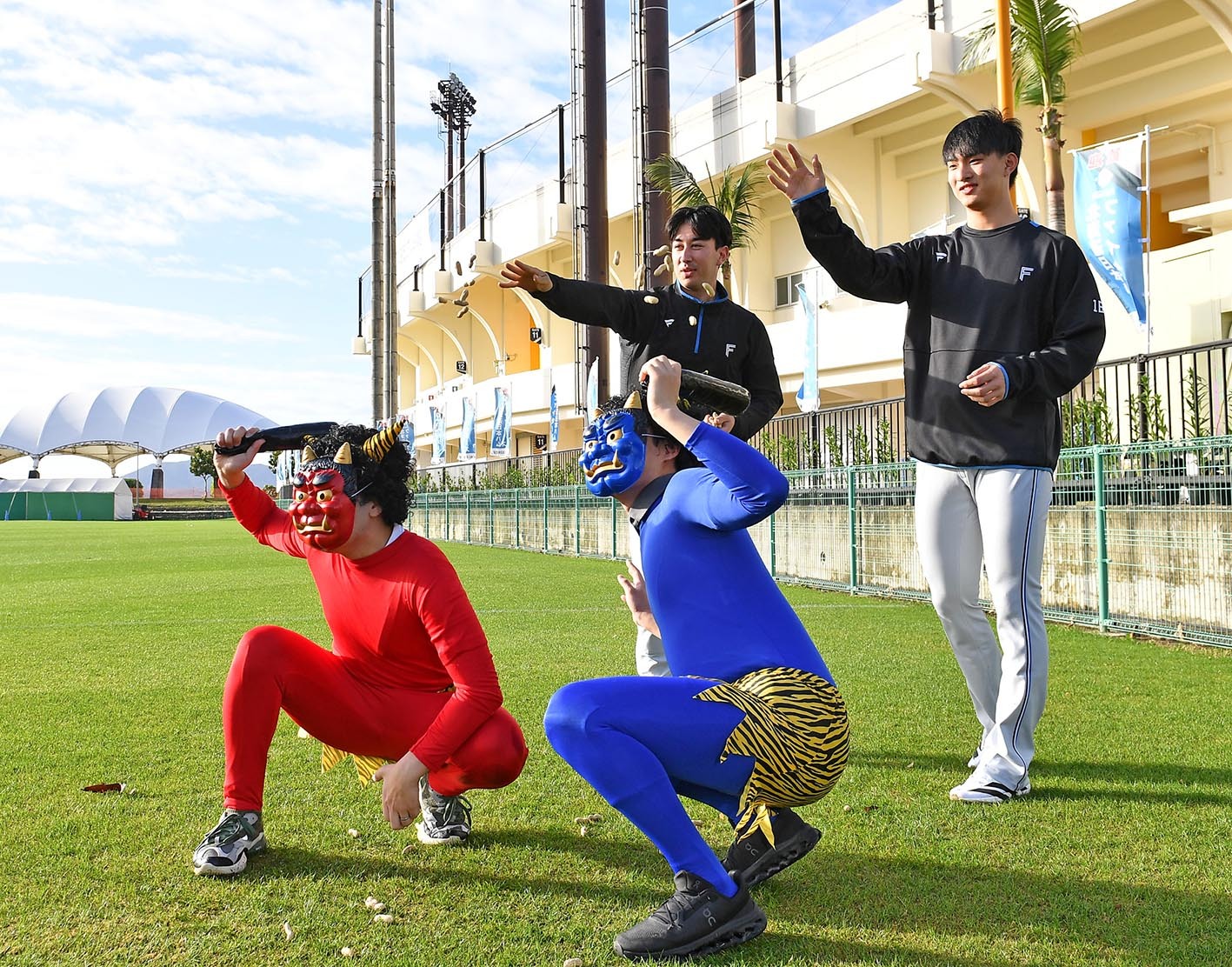 日本ハムの達孝太投手(20)、山口アタル外野手(25)が2日、沖縄・名護で行われている春季キャンプのトレーニング開始前に節分の豆まきを実施した。球場敷地内に現れた赤鬼、青鬼に対し、「鬼は外」のかけ声とともに豆を投げ、見事に退治してみせた。
