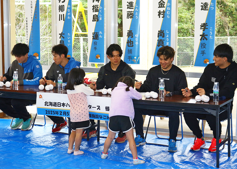 日本ハムの柳川大晟投手(21)、福島蓮投手(21)、進藤勇也捕手(22)、金村尚真投手(24)、達孝太投手(20)が5日、キャンプ休日に合わせて沖縄県名護市の児童養護施設「なごみ」を訪れ、子供たちと触れ合った。