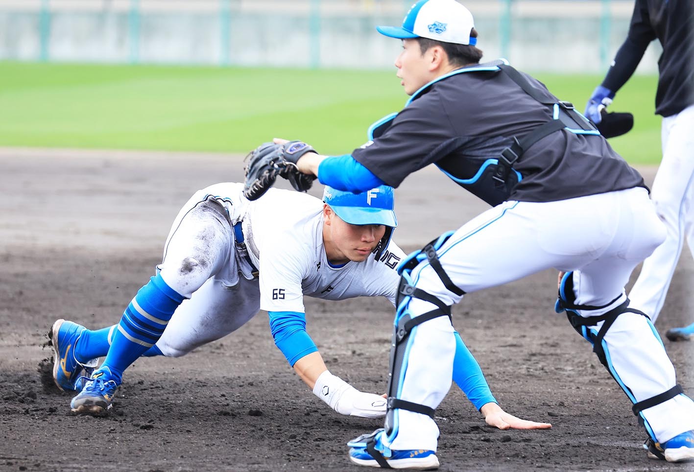 日本ハムの明瀬諒介内野手(19)が6日、沖縄・名護で行われた1軍キャンプの練習に参加した。4日に国頭で行われた紅白戦で1安打を放つと、視察していた新庄剛志監督(53)の「1軍の中に入ってのプレーぶりを見てみたい」という意向を受けて、7日までの練習参加が実現した。2年目シーズンを迎えた若きスラッガーが、チャンスをものにして主力への第一歩を踏み出していく。主な一問一答は以下の通り。