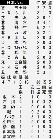 打線は15安打6得点。0―0の二回、9番・水野達稀内野手(24)が先制打を放つと、2番・矢沢宏太外野手(24)の中犠飛と4番・野村佑希内野手(24)のタイムリーで計3点を奪った。3―2の四回には5番・万波中正外野手(24)の適時打と敵失で2点を加えた。5―4の七回には水野の三塁打を足掛かりに3番・清宮幸太郎内野手(25)のタイムリーで1点を挙げ、突き放した。