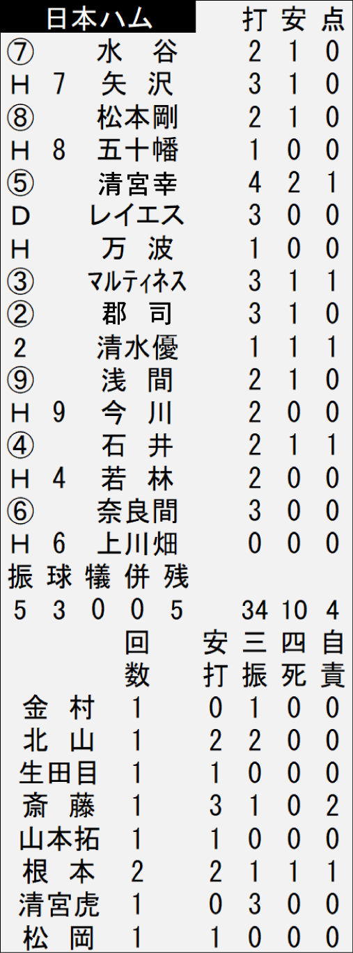 一回、先頭の水谷瞬外野手(23)が右中間を破る二塁打で出塁。続く松本剛外野手(31)も右前打でつなぎ、無死一、三塁と好機を広げた。ここで松本剛が二盗を試み、一、二塁間に挟まれている間に水谷がホームイン。足技で先制した。二回には2死三塁で8番の石井一成内野手(30)が右翼線に適時二塁打を放ち、2ー0とした。2-2の五回には2死二塁で3番の清宮幸太郎内野手(25)が右前にはじき返し、二走の五十幡亮汰外野手(26)を勝ち越しのホームに迎え入れた。3ー3の八回にはアリエル・マルティネス捕手(28)の適時二塁打で再び勝ち越しに成功。続く清水優心捕手(28)にもタイムリーが飛び出した。