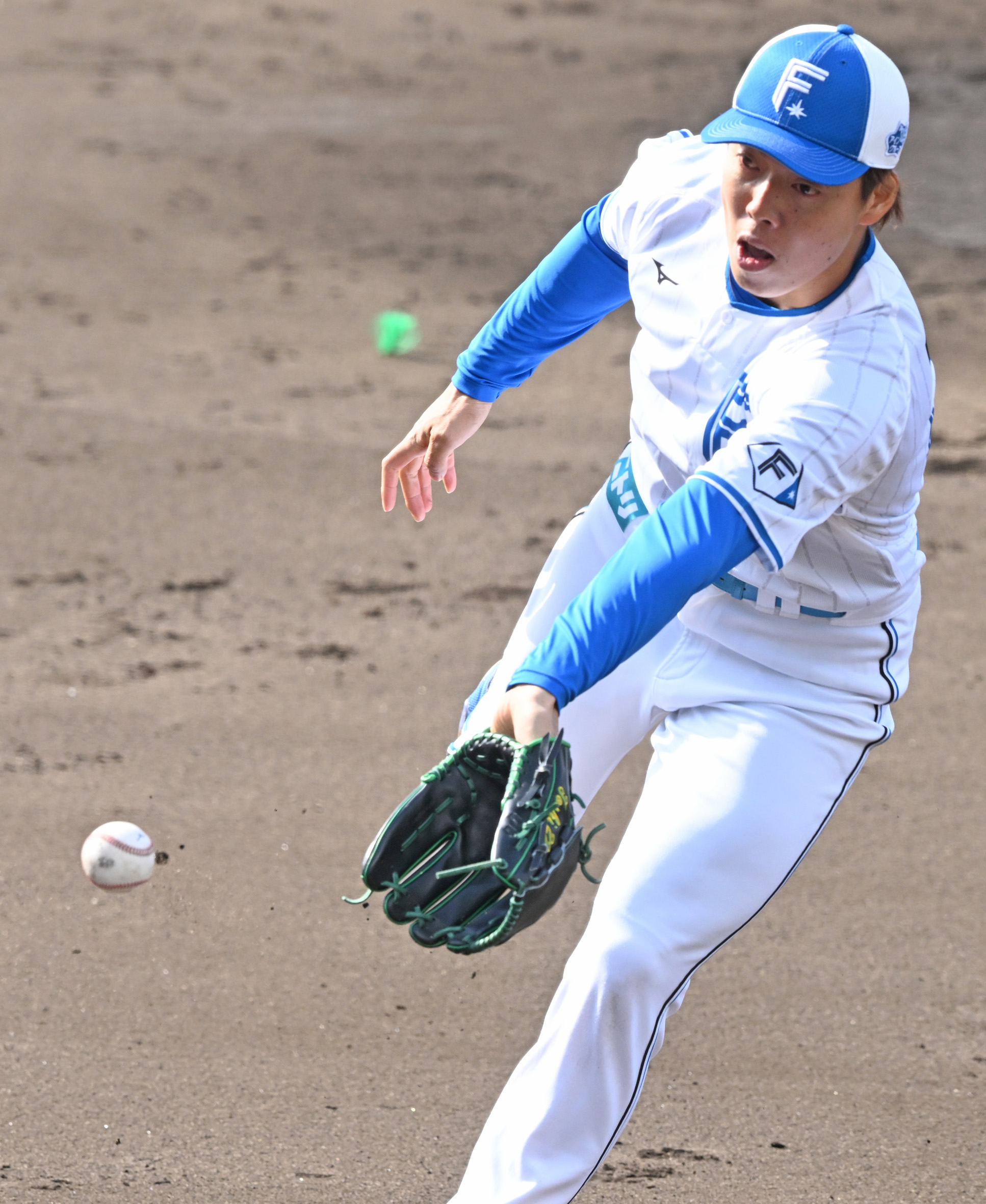 投内連係の順番を待つ伊藤(上)と杉浦