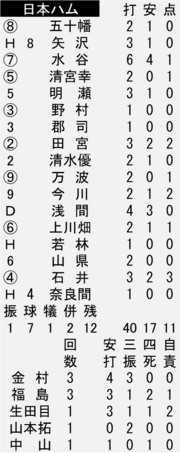 打線は17安打12得点をマークした。一回、3番・清宮幸太郎内野手(25)の内野ゴロの間に先制点を奪うと、田宮裕涼捕手(24)、上川畑大悟内野手(28)のタイムリーと万波中正外野手(24)の右犠飛で3点を追加した。二回には水谷瞬外野手(23)の適時打で1点を加えた。四回には田宮のタイムリーと敵失で2点を奪って突き放した。7ー1の六回には石井一成内野手(30)の3ランと今川優馬外野手(28)の2点タイムリーで一挙5点を追加した。