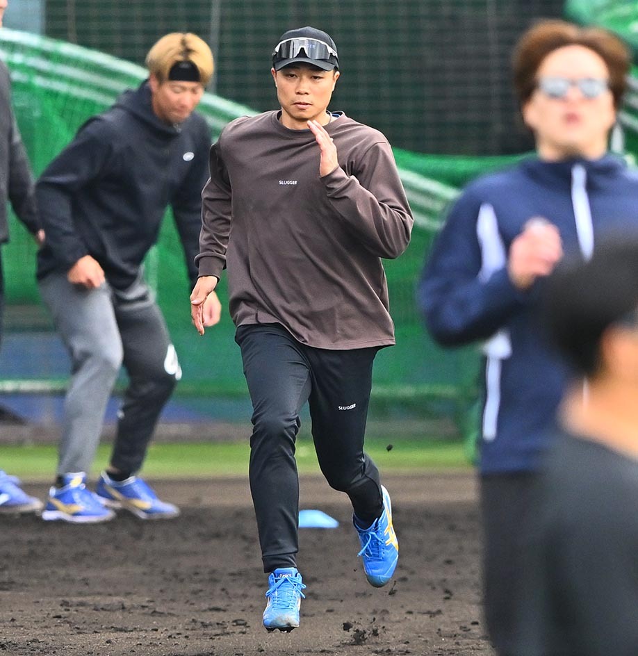 1月29日、先乗り自主トレで走塁練習する中島(中央)