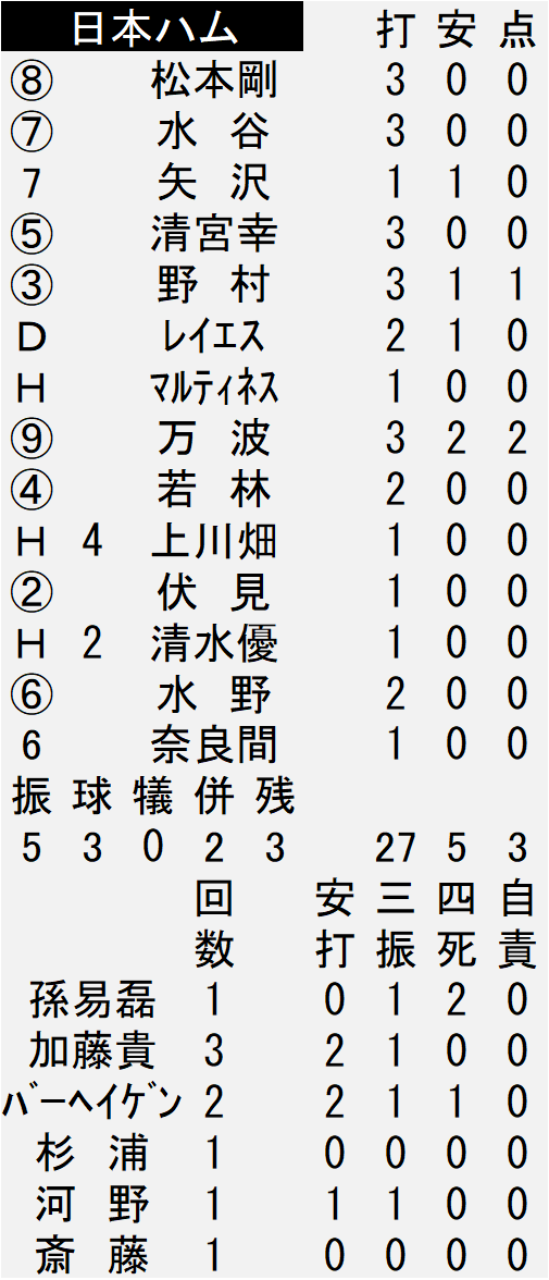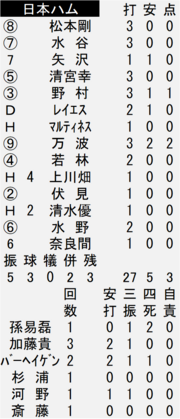 0ー0の四回、2死から5番のフランミル・レイエス外野手(29)が右前にはじき返すと、右翼手の失策も重なり二進した。ここで続く万波中正外野手(24)が左翼スタンドに先制の2ランを突き刺した。打線は六回、1死二塁で4番の野村佑希内野手(24)が左前にタイムリーを放ち、突き放した。