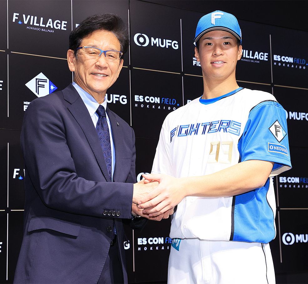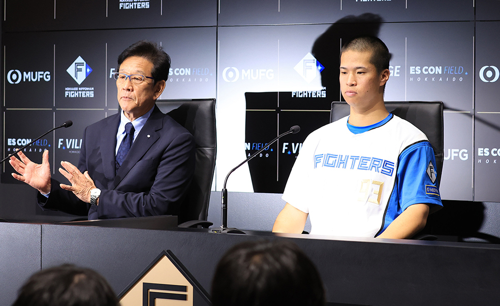 栗山CBO(以下栗)「若くて何とか夢を成し遂げたいと思っている選手たちが、こうやって一つ一つ目標をかなえていく。背番号が変わって、握手するときに本当にうれしそうな表情を見ることが、われわれにとってもすごくうれしい。本人に伝えましたけど、ここからが勝負だし、今のボールを見ていたら、大きく花開く可能性が高いと思う。頑張ってもらいたいと思います。もともとファイターズに来てもらうときから、数値的にもそうですが、ボールの強さを評価して来てもらったので、こうやって1軍の試合で出せるようになってきているのは楽しみ。ぜひ、みなさん、応援してあげてほしい。必ず、チームの優勝に貢献してくれると思うので、よろしくお願いします」