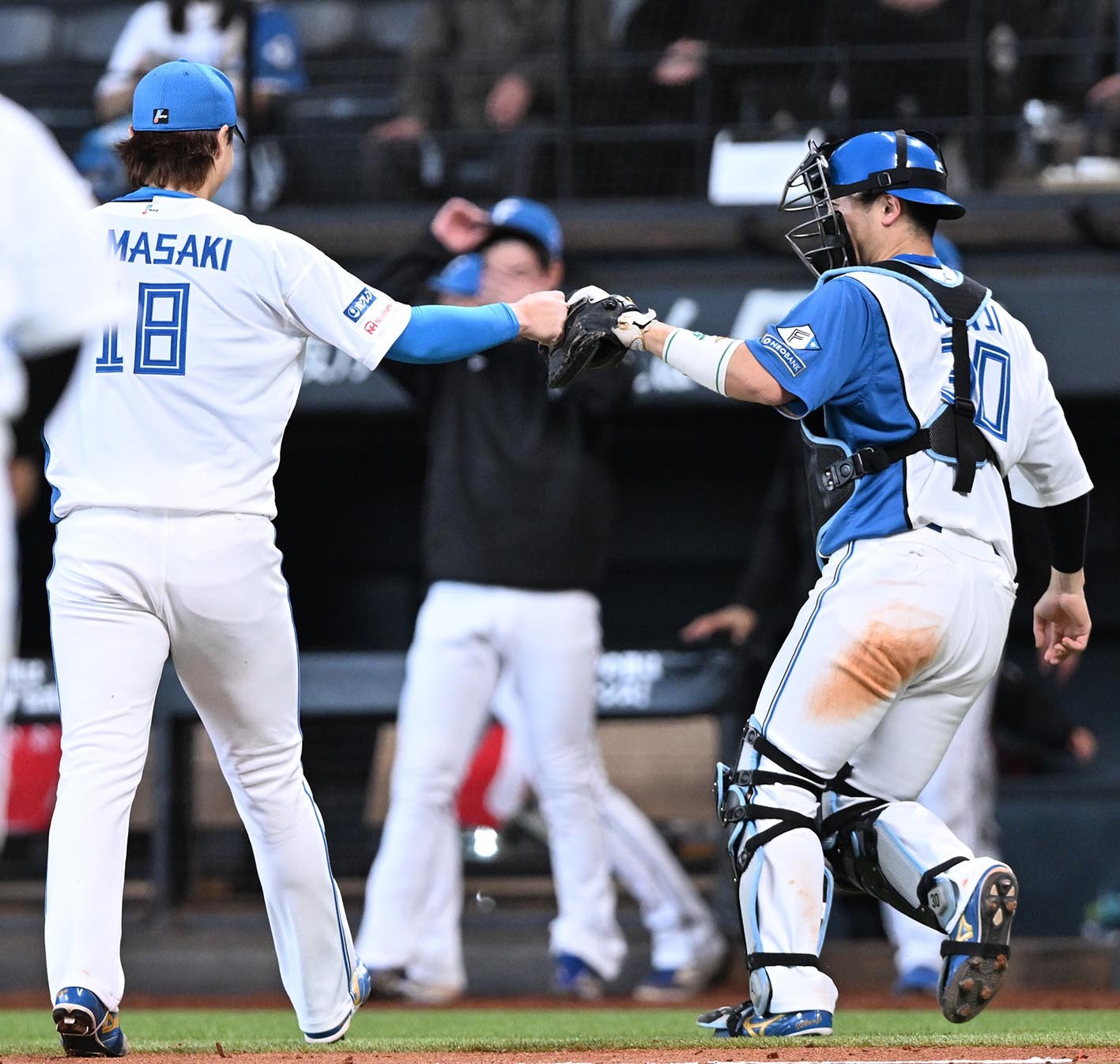五回を無失点に抑え山崎(左)と郡司がグラブタッチを交わす