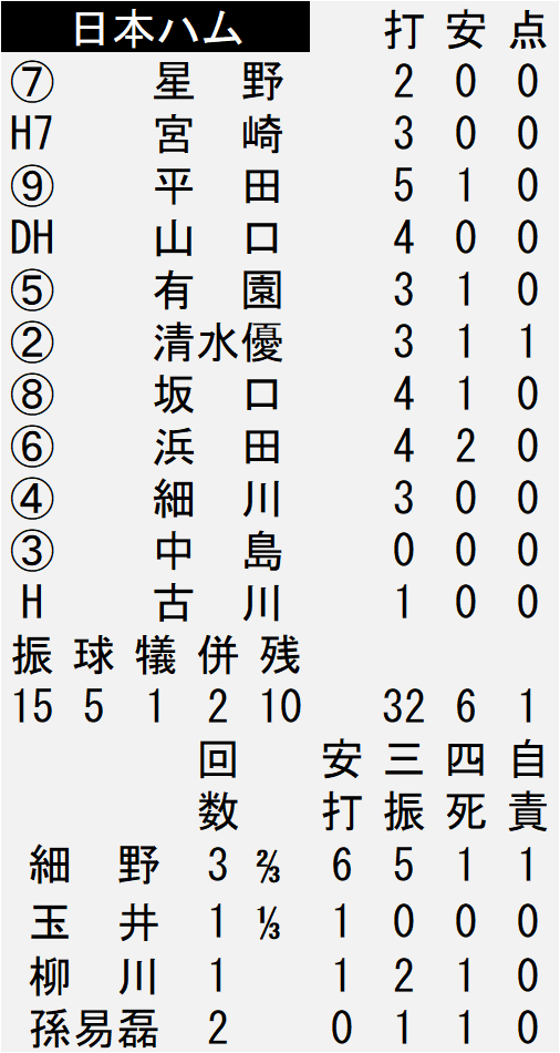 先発の細野晴希投手(23)は四回2死満塁のピンチで先制打を浴びて降板。玉井大翔投手(32)に代わったが、味方のエラーも重なって追加点を許した。