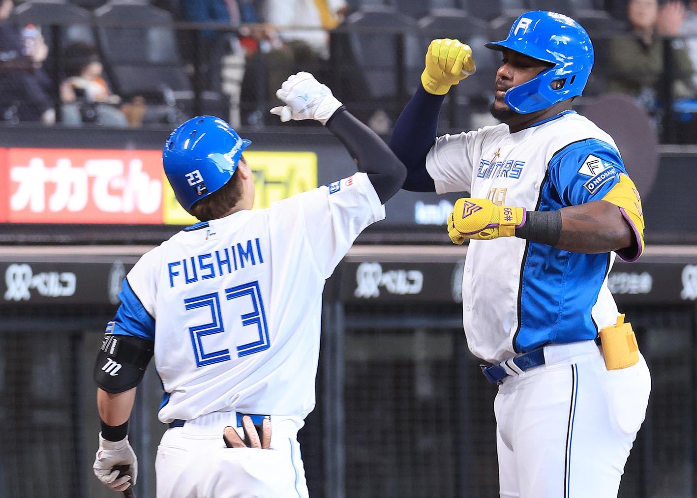 打線は粘りを見せつけた。0―1の六回2死一、二塁で代打の今川優馬外野手(28)が中前にはじき返す同点打。敵失も重なり、一走の万波中正外野手(24)が逆転のホームに生還した。2―3の八回には先頭のフランミル・レイエス外野手(29)がバックスクリーン左へ豪快な同点弾を叩き込んだ。