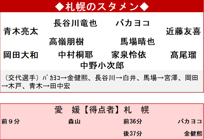 北海道コンサドーレ札幌は愛媛FCと敵地で対戦し、2-1で逆転勝利した。前節に今季初勝利挙げて19位だった札幌は20位の愛媛を下しての2連勝となり、順位は自動降格圏を脱出する15位に浮上した。