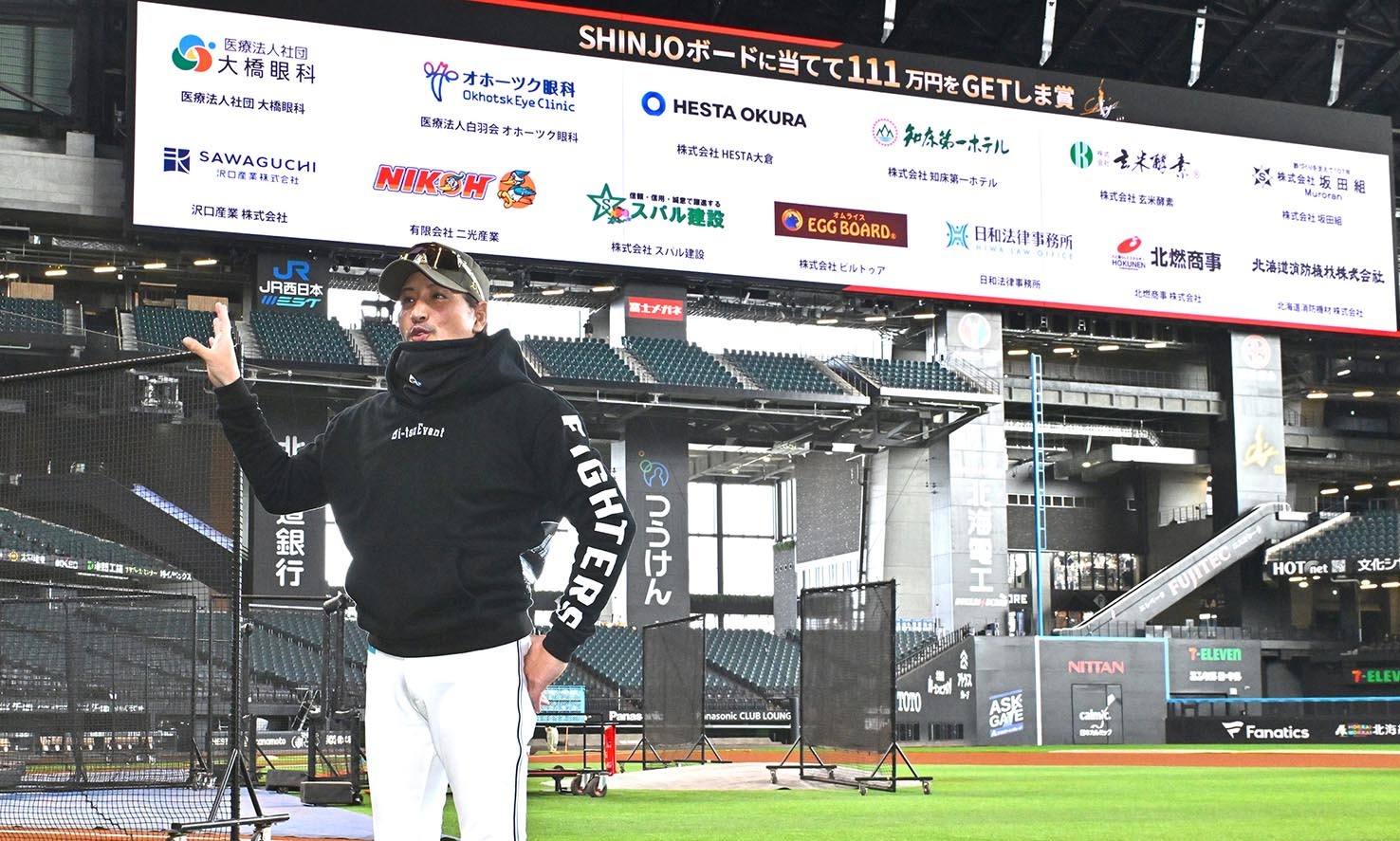 日本ハムの新庄剛志監督(53)が25日、エスコンフィールド北海道で行われた全体練習前に取材に応じ、両翼スタンドに設置された看板にホームランを当てたら賞金がもらえる「SHINJOボードに当てて111万円をGETしま賞」企画に、昨年を大きく上回る計13社のスポンサーがついたことを発表した。