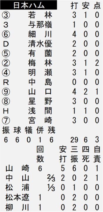 先発した山崎福也投手(32)が三回、ヤクルト・山田哲人内野手にソロアーチを浴び、先制を許した。が、六回2死一、二塁、5番・梅林優貴捕手(27)の2点三塁打で2-1と逆転。しかし直後にまた逆転される。七回無死満塁、一塁守備に就いていたマイカ与那嶺捕手(24)が打球を後逸して2者生還。再びリードを奪われたが、結果的に接戦を制した。