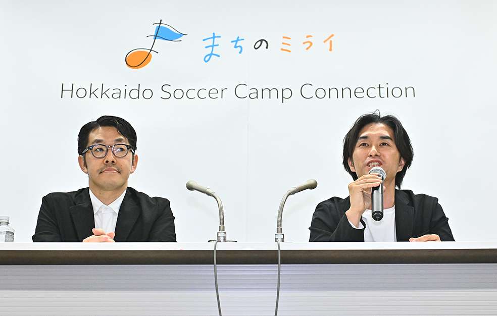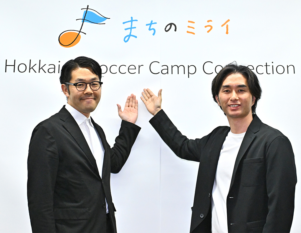 「北海道サッカーキャンプコネクション」の設立を発表する、まちのミライの菅井副取締役社長(右)と渡部特任執行役員=撮影・桜田史宏