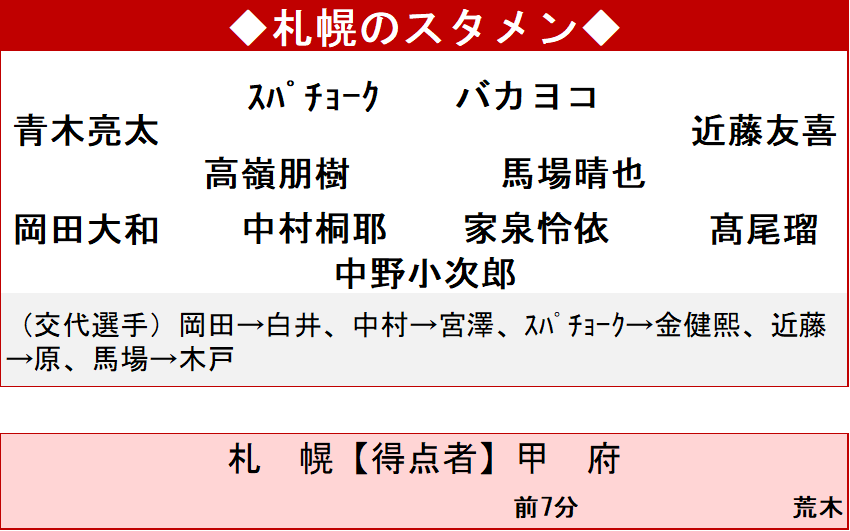 後半のシュート数は甲府の「3」に対し、札幌は「6」と攻撃する回数は増えたが、しっかりと5-4-1で守備を堅められ、はね返されてしまう。