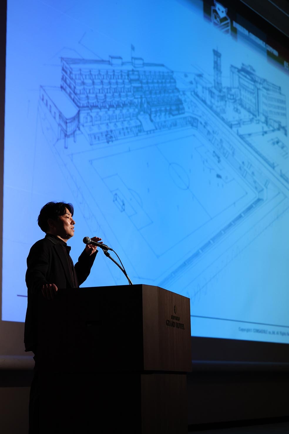 先代の遺志と夢を継ぐ。石水社長は講演の最終盤に、クラブ創設を主導した故・石水勲氏が1999年に描いた1枚の絵をスライドに映し出した。現在クラブが練習場とする宮の沢・白い恋人サッカー場に大きな客席が設置された専用スタジアムは、コンサドーレの生みの親である父の夢でもあった。