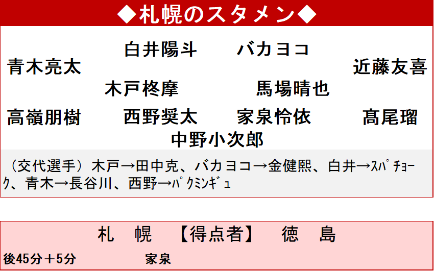 リーグ戦7試合で5試合無失点中と守備力の高い徳島に対し、札幌はこれまでボランチで先発していたMF高嶺朋樹主将(27)を左サイドバックに置く4-4-2で臨み、高嶺の代わりには道産子ルーキーMF木戸柊摩(22)が入った。