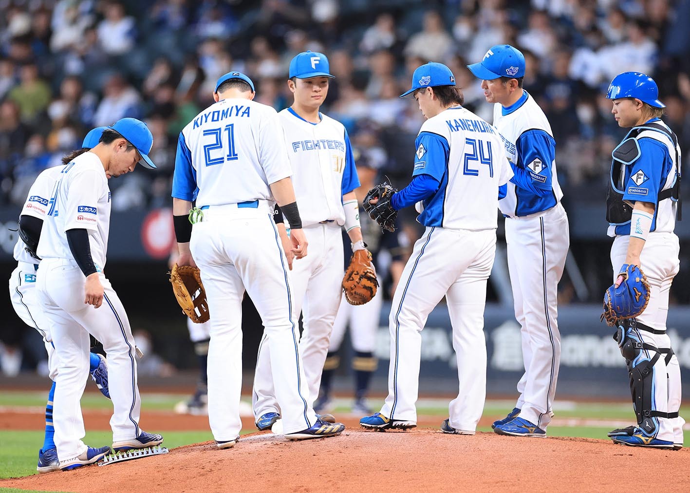 四回4失点後、オリックス・福田を前にマウンドへ集まる日本ハムの選手たち