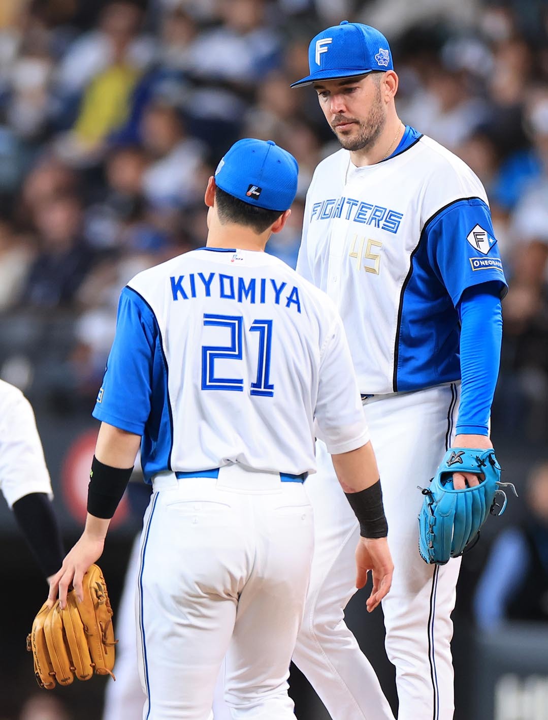 六回、守備のミスを犯した清宮幸(手前)が先発のバーヘイゲンへ申し訳なさそうに声を掛ける
