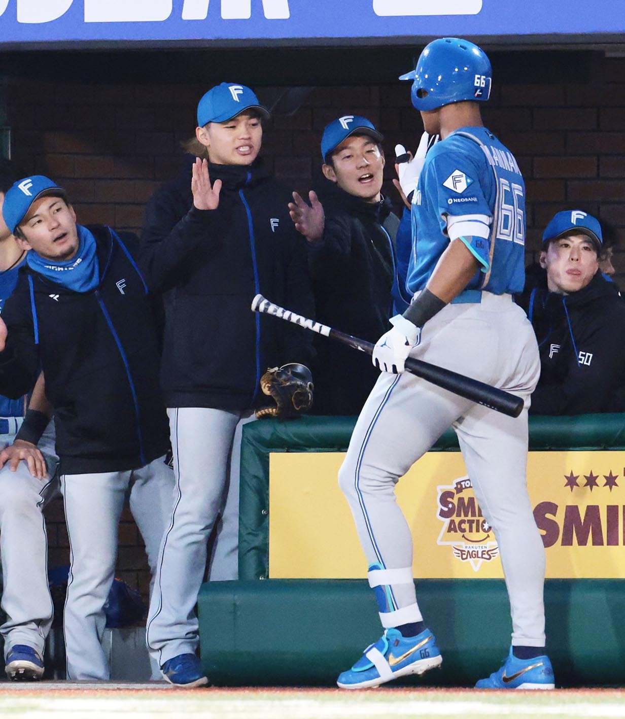 二回2死、先制の3号ソロを放った万波がチームメートとハイタッチ=撮影・桜田史宏