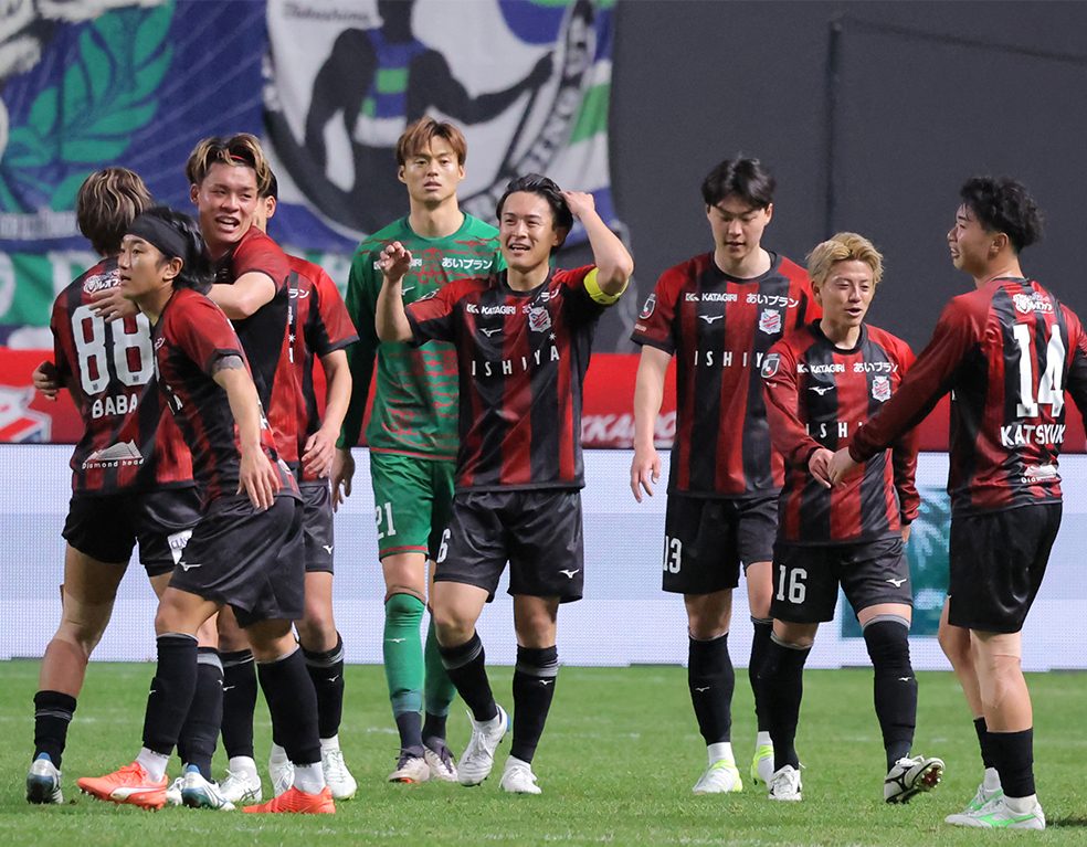 4月5日の徳島戦を1-0で勝利し、喜ぶ札幌イレブン。中央はMF高嶺主将