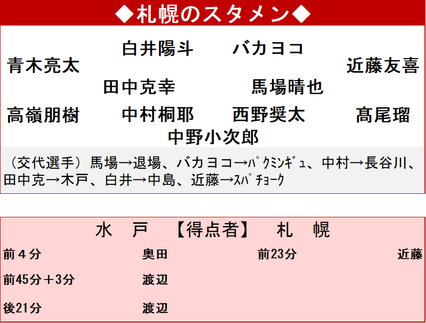 勝ち点9で並ぶ水戸に対して2連勝を狙った札幌だったが、かなわなかった。スタートはDF家泉怜依(25)の体調不良もあり、前節から2人のメンバーを入れ替え。DF中村桐耶(24)が2試合ぶり先発で左CB、MF田中克幸(23)が7試合ぶりに先発してボランチに入った。