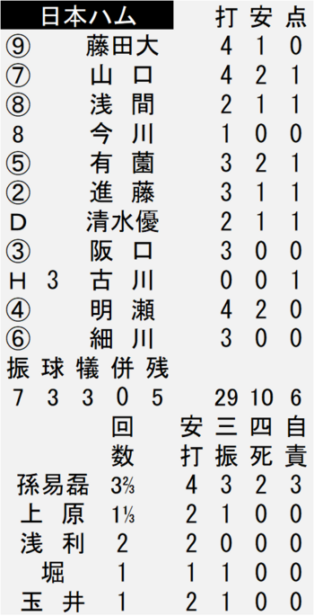 打線は1点を先制された直後の一回、 4番の有薗直輝内野手(21)が同点タイムリー。さらに5番・進藤勇也捕手(23)と6番・清水優心捕手(28)の犠飛で2点を加えた。三回には浅間大基外野手(28)が3号ソロを放ち、4―1とした。4ー5で迎えた八回には2番の山口アタル外野手(25)が右翼芝生席に1号同点弾を突き刺した。さらに1死満塁と攻め立て、代打の古川裕大捕手(26)が勝ち越しの左犠飛を打ち上げた。