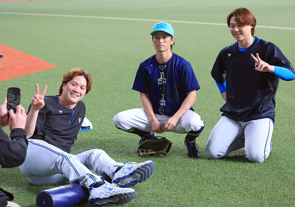 オリックス・福田(中央)と球団広報のカメラに収まる山崎(右)と伏見