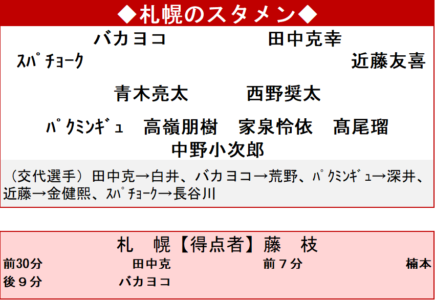 ここまで3勝6敗と波に乗りきれない札幌だったが、前節水戸戦で退場処分を受けたDF馬場晴也(23)が2試合出場停止になったこともあり、前節から大幅にフォーメーションを変えた。キャプテンのMF高嶺朋樹(27)を4バックのセンターバックに、DF西野奨太(20)をアンカーに起用。MF田中克幸(23)をトップ下に据えた。